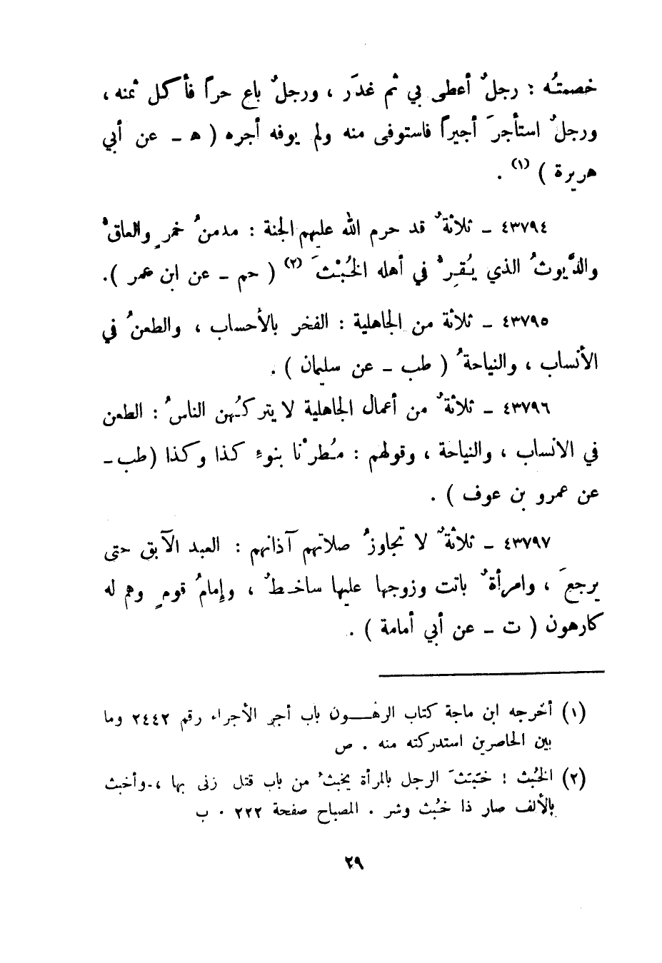 خصمته: رجل أعطى بي ثم غدر، ورجل باع حرا فأكل ثمنه، ورجل استأجر أجيرا فاستوفى منه ولم يوفه أجره. "هـ - عن أبي هريرة"1.