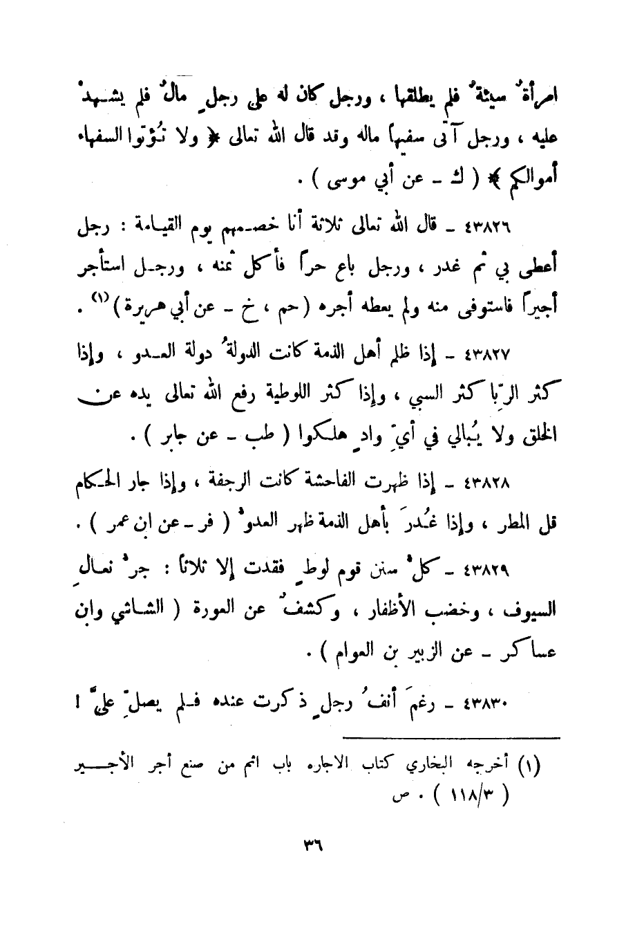 43826- قال الله تعالى ثلاثة أنا خصمهم يوم القيامة: رجل أعطى بي ثم غدر، ورجل باع حرا فأكل ثمنه، ورجل استأجر أجيرا فاستوفى منه ولم يعطه أجره. "حم، خ - عن أبي هريرة"1.