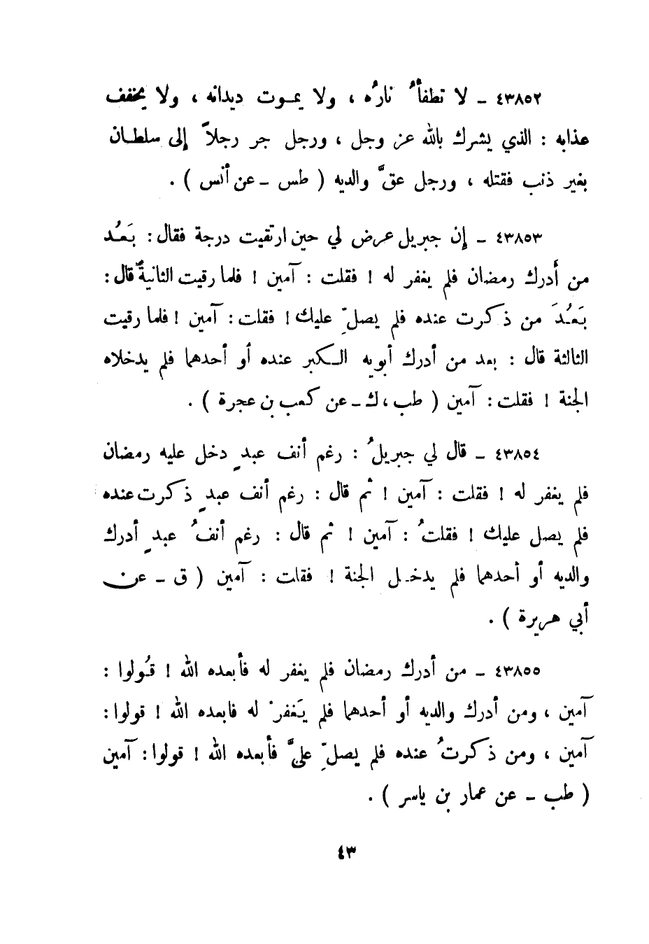 43855- من أدرك رمضان فلم يغفر له فأبعده الله! قولوا: آمين، ومن أدرك والديه أو أحدهما فلم يغفر له فأبعده الله! قولوا: آمين، ومن ذكرت عنده فلم يصل علي فأبعده الله! قولوا: آمين. "طب - عن عمار بن ياسر".