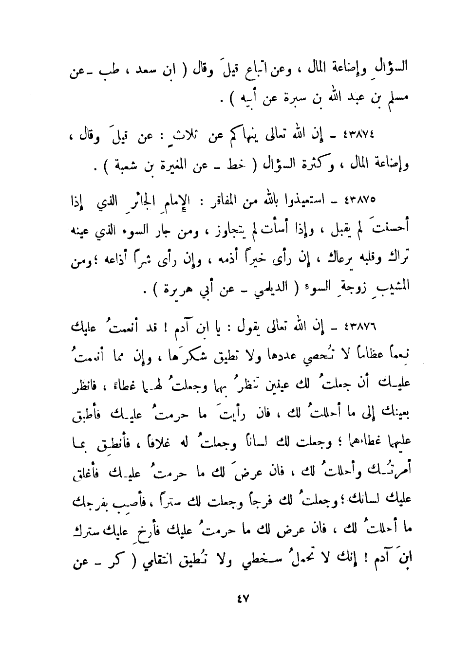 السؤال وإضاعة المال، وعن اتباع قيل وقال. "ابن سعد، طب - عن مسلم بن عبد الله بن سبرة عن أبيه".