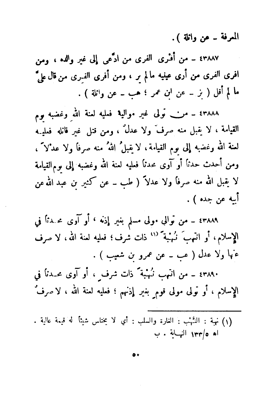 43889- من توالى مولى مسلم بغير إذنه، أو آوى محدثا في الإسلام، أو انتهب نهبة 1 ذات شرف؛ فعليه لعنة الله، لا صرف عنها ولا عدل. "عب - عن عمرو بن شعيب".