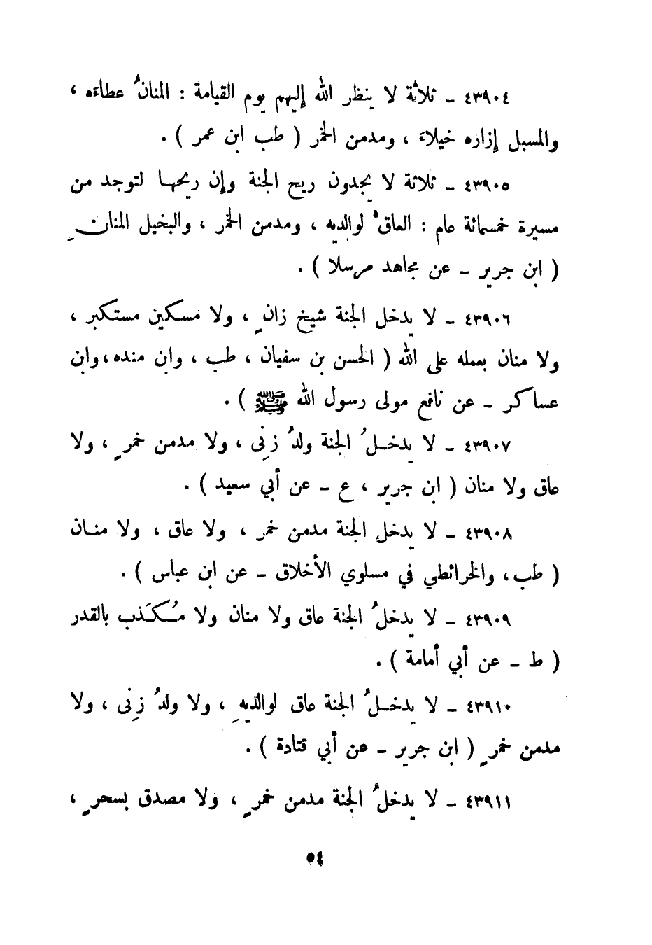 43905- ثلاثة لا يجدون ريح الجنة، وإن ريحها لتوجد من مسيرة خمسمائة عام: العاق لوالديه، ومدمن الخمر، والبخيل المنان. "ابن جرير - عن مجاهد مرسلا".