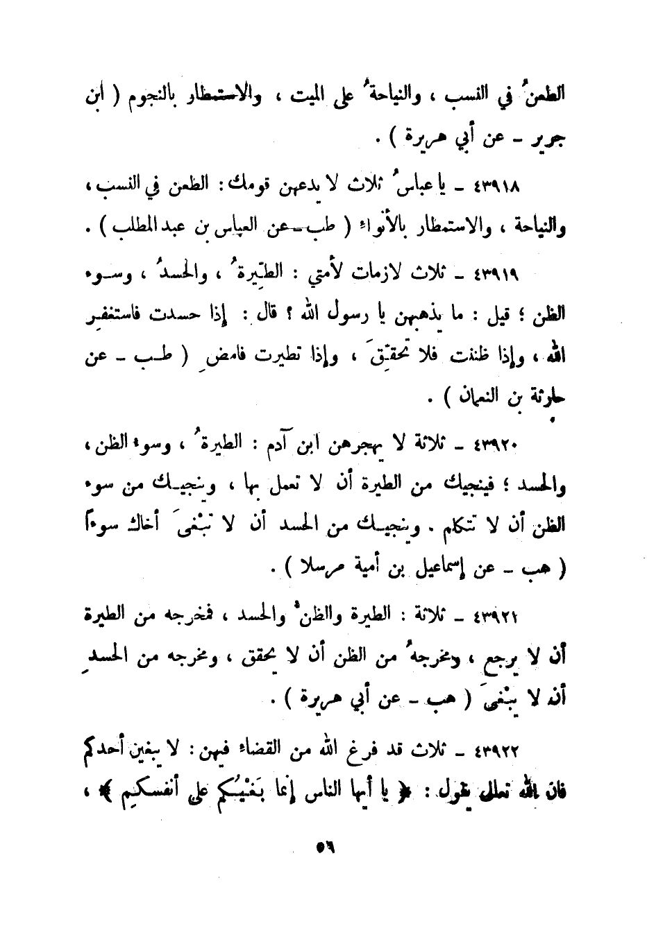 43920- ثلاثة لا يهجرهن ابن آدم: الطيرة، وسوء الظن، والحسد؛ فينجيك من الطيرة أن لا تعمل بها، وينجيك من سوء الظن أن لا تتكلم، وينجيك من الحسد أن لا تبغى أخاك سوءا. "هب - عن إسماعيل بن أمية مرسلا".