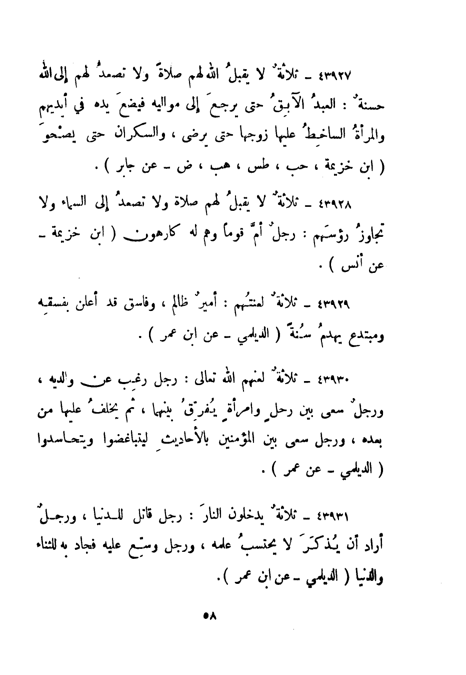 43929- ثلاثة لعنتهم: أمير ظالم، وفاسق قد أعلن بفسقه ومبتدع يهدم سنة. "الديلمي - عن ابن عمر".