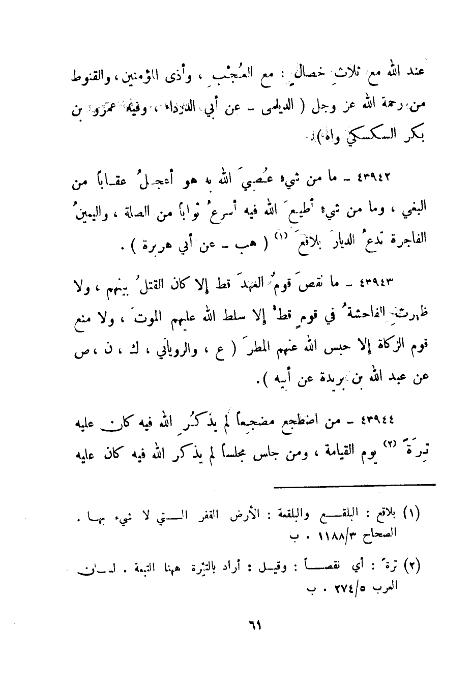 43944- من اضطجع مضجعا لم يذكر الله فيه كان عليه ترة 2 يوم القيامة، ومن جلس مجلسا لم يذكر الله فيه كان عليه