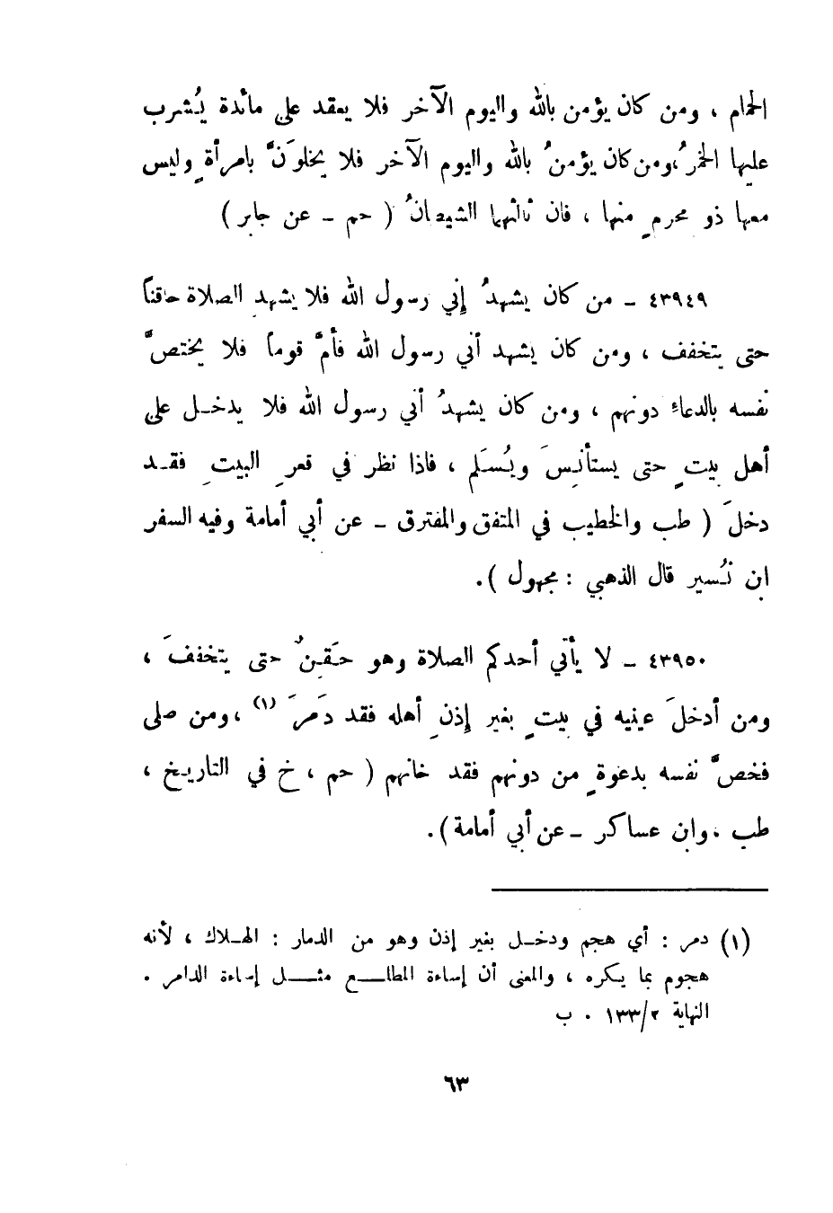 43949- من كان يشهد إني رسول الله فلا يشهد الصلاة حاقنا حتى يتخفف، ومن كان يشهد أني رسول الله فأم قوما فلا يختص نفسه بالدعاء دونهم، ومن كان يشهد أني رسول الله فلا يدخل على أهل بيت حتى يستأنس ويسلم، فإذا نظر في قعر البيت فقد دخل. "طب والخطيب في المتفق والمفترق - عن أبي أمامة وفيه السفر ابن نسير قال الذهبي: مجهول".