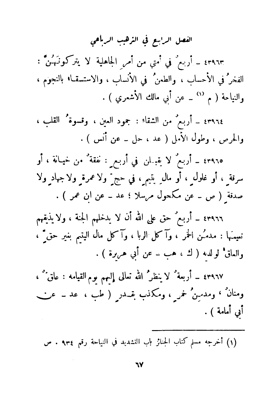 43963- أربع في أمتي من أمر الجاهلية لا يتركونهن: الفخر في الأحساب، والطعن في الأنساب، والاستسقاء بالنجوم، والنياحة. "م 1 - عن أبي مالك الأشعري".