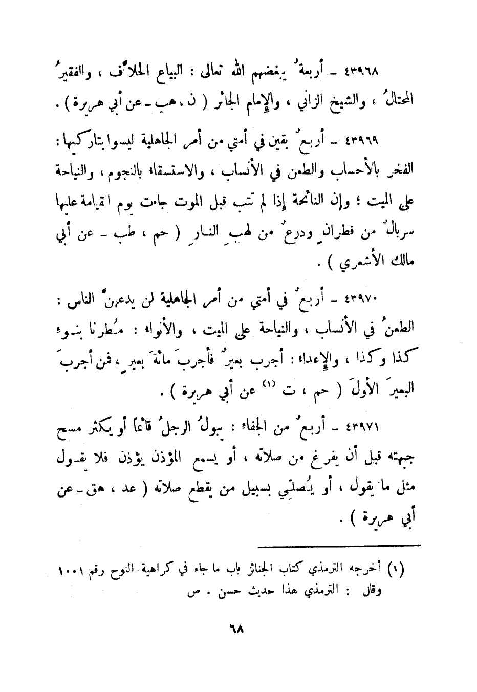43969- أربع بقين في أمتي من أمر الجاهلية ليسوا بتاركيها: الفخر بالأحساب والطعن في الأنساب، والاستسقاء بالنجوم، والنياحة على الميت؛ وإن النائحة إذا لم تتب قبل الموت جاءت يوم القيامة عليها سربال من قطران ودرع من لهب النار. "حم، طب - عن أبي مالك الأشعري".