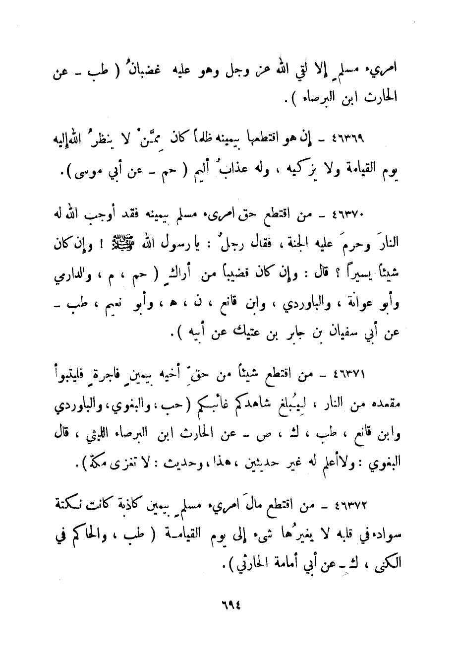 46370- "من اقتطع حق امرئ مسلم بيمينه فقد أوجب الله له النار وحرم عليه الجنة، فقال رجل: يا رسول الله صلى الله عليه وسلم! وإن كان شيئا يسيرا؟ قال: وإن كان قضيبا من أراك. " حم، م، والدارمي وأبو عوانة، والباوردي، وابن قانع، ن، هـ، وأبو نعيم، طب - عن أبي سفيان بن جابر بن عتيك عن أبيه".