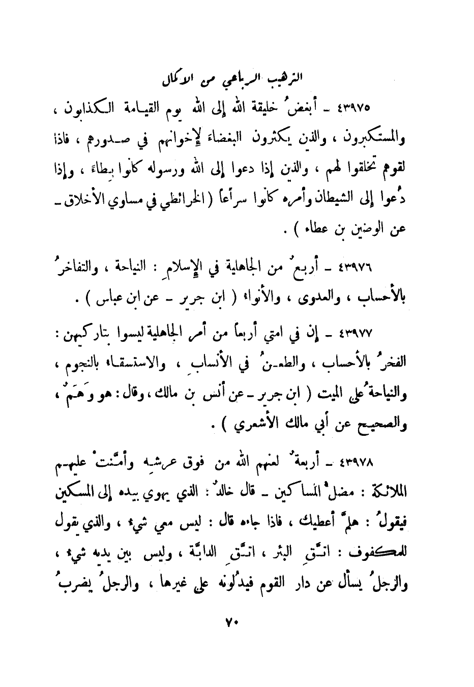 43976- أربع من الجاهلية في الإسلام: النياحة، والتفاخر بالأحساب، والعدوى، والأنواء. "ابن جرير - عن ابن عباس".