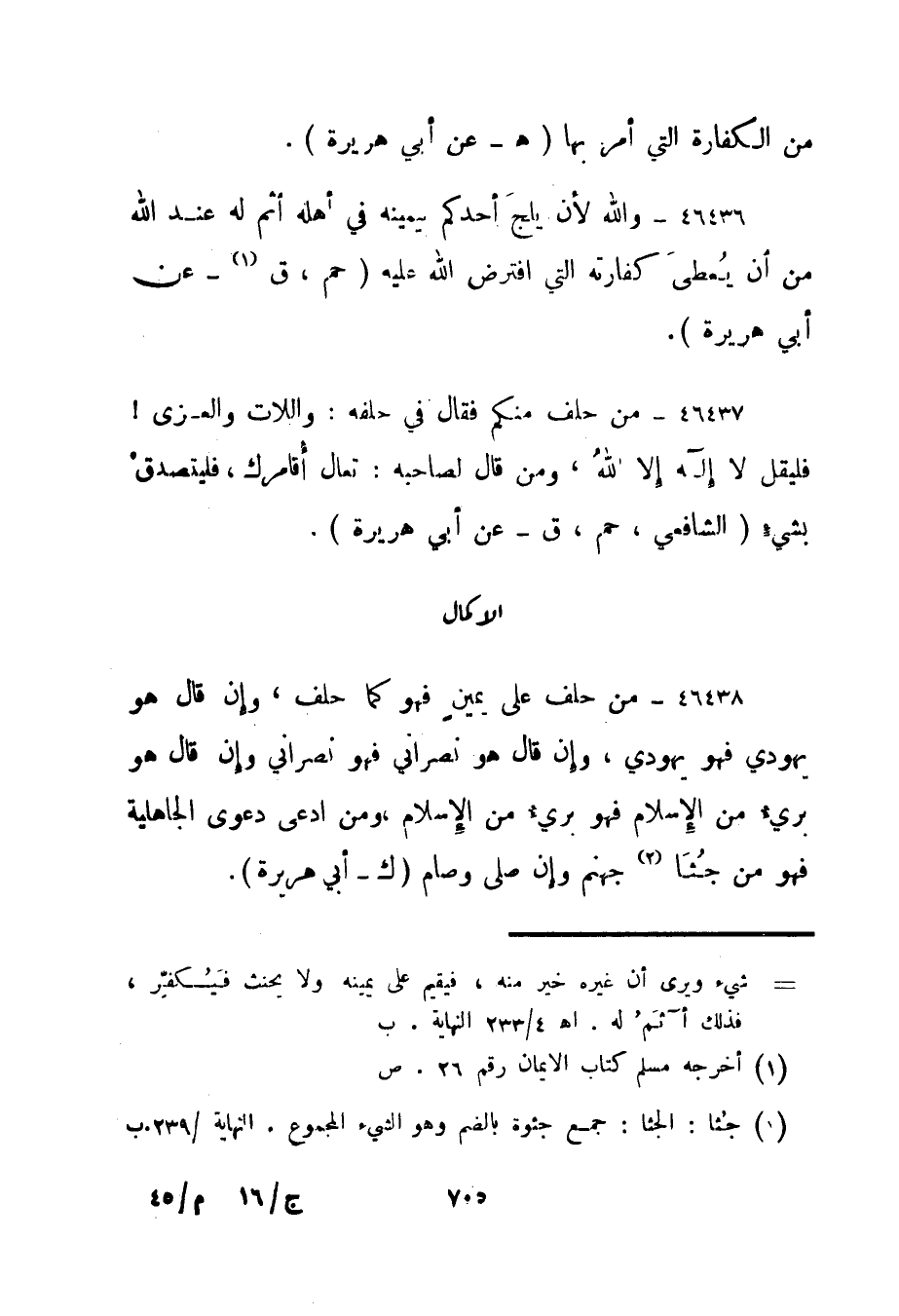 46438- "من حلف على يمين فهو كما حلف، وإن قال هو يهودي فهو يهودي، وإن قال هو نصراني فهو نصراني وإن قال هو بريء من الإسلام فهو بريء من الإسلام، ومن ادعى دعوى الجاهلية فهو من جثا 2 جهنم وإن صلى وصام. " ك - أبي هريرة".
