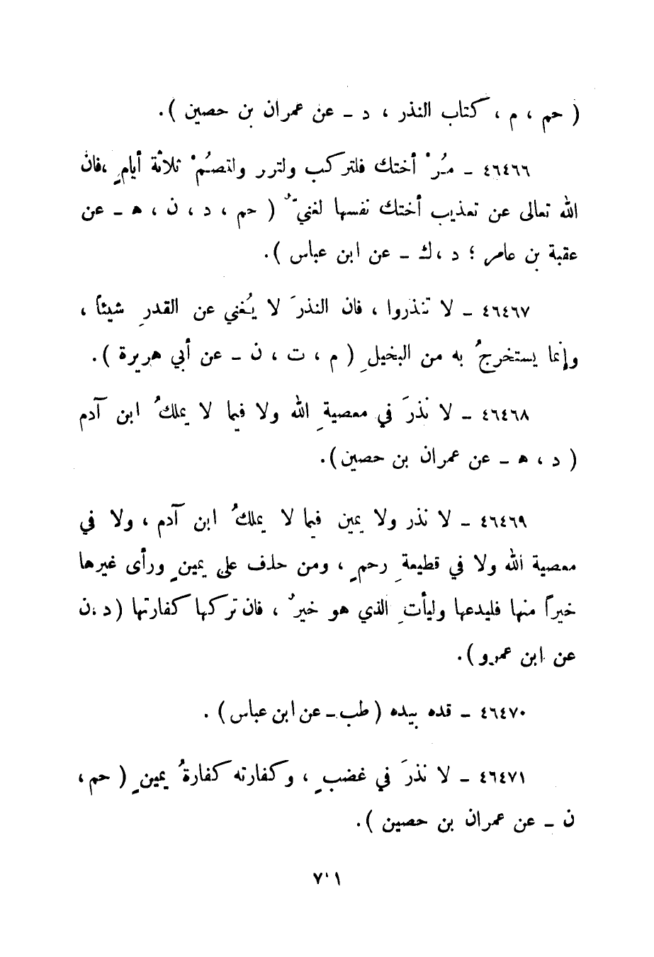 46471- "لا نذر في غضب، وكفارته كفارة يمين. " حم، ن - عن عمران بن حصين".