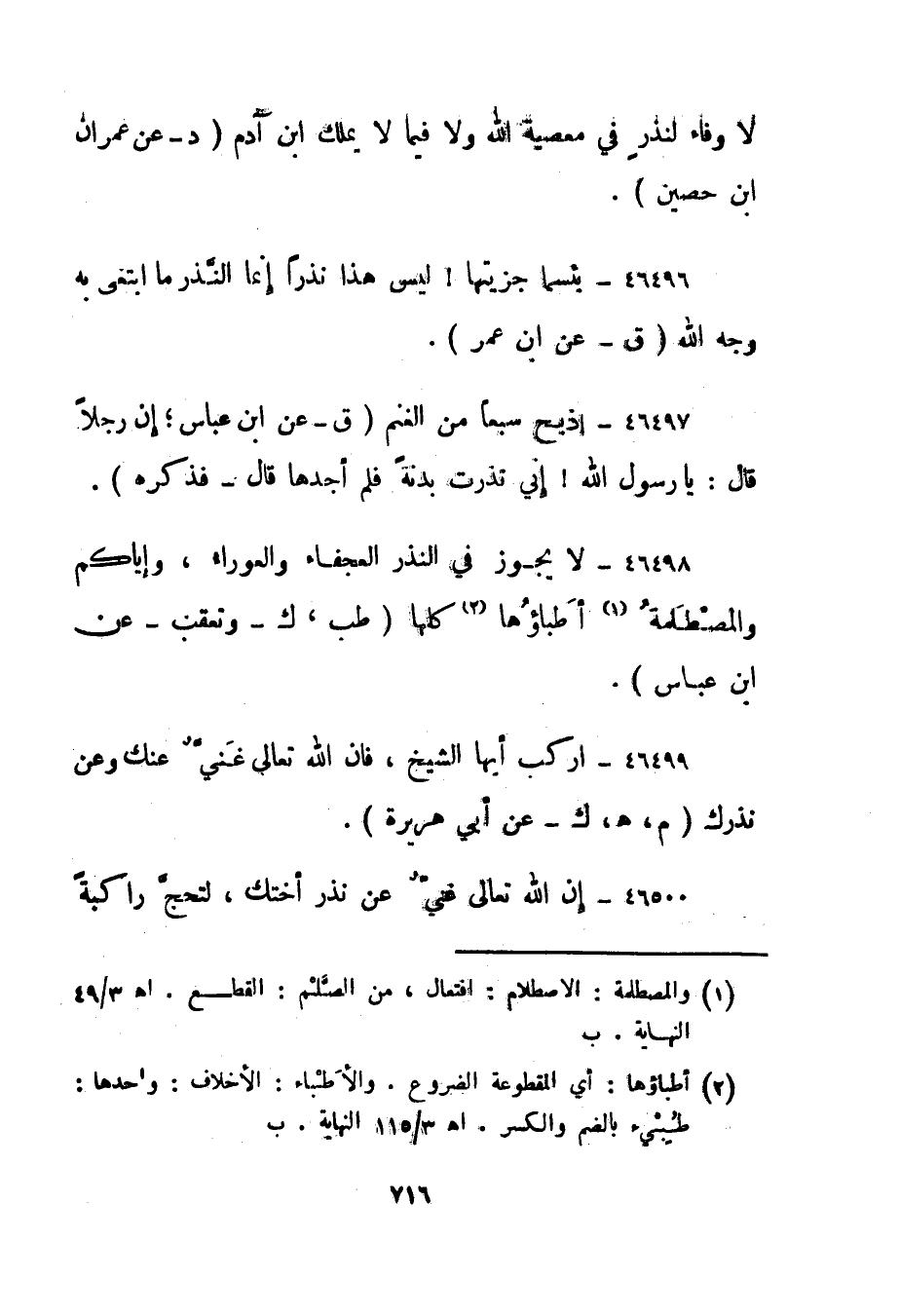 لا وفاء لنذر في معصية الله ولا فيما لا يملك ابن آدم. " د - عن عمران ابن حصين".