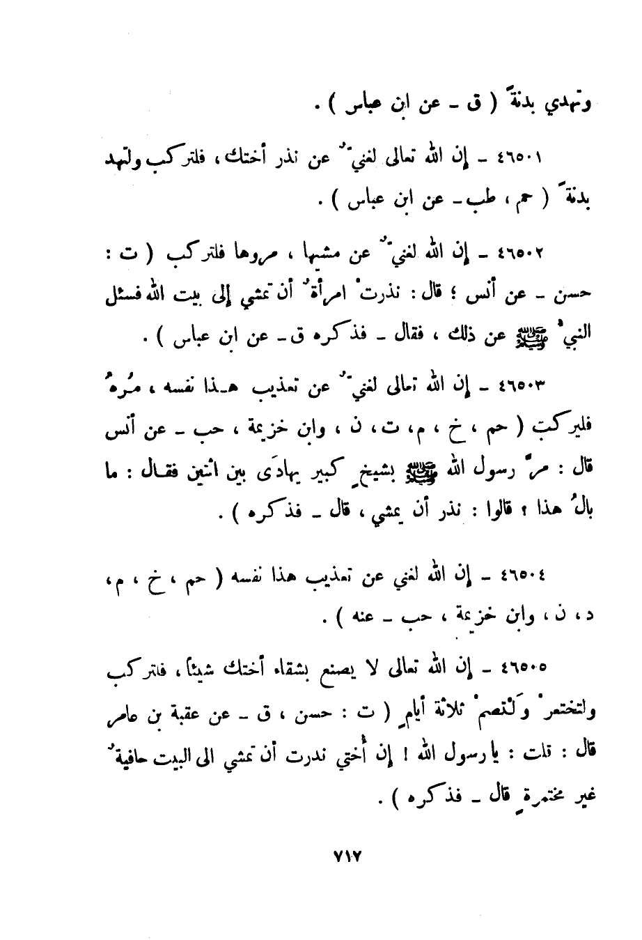 46502- "إن الله لغني عن مشيها، مروها فلتركب. " ت: حسن - عن أنس؛ قال: نذرت امرأة أن تمشي إلى بيت الله فسئل النبي صلى الله عليه وسلم عن ذلك، فقال - فذكره ق - عن ابن عباس".