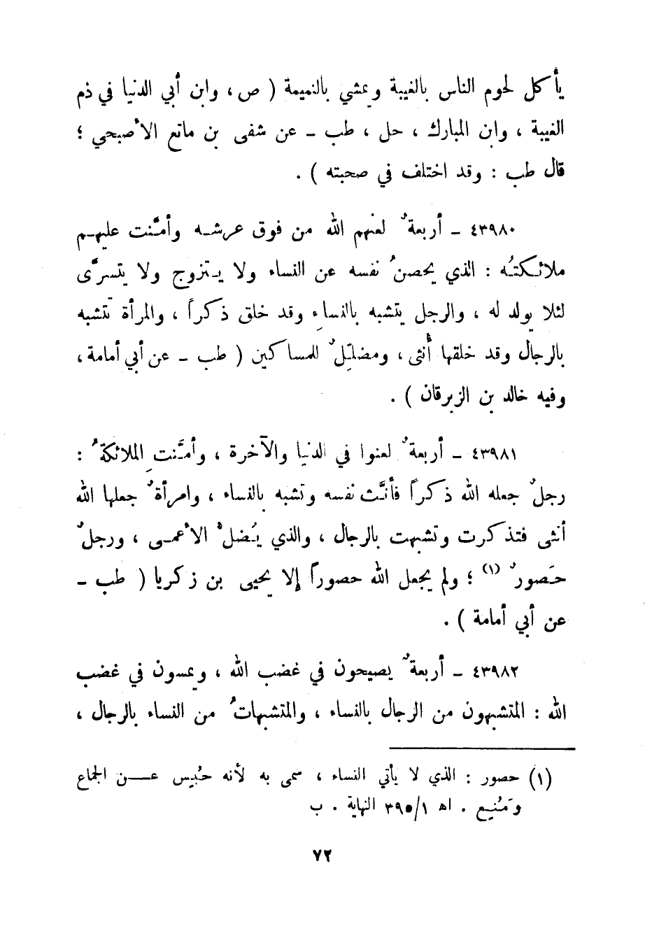 43981- أربعة لعنوا في الدنيا والآخرة، وأمنت الملائكة: رجل جعله الله ذكرا فأنث نفسه وتشبه بالنساء، وامرأة جعلها الله أنثى فتذكرت وتشبهت بالرجال، والذي يضل الأعمى، ورجل حصور 1؛ ولم يجعل الله حصورا إلا يحيى بن زكريا. "طب - عن أبي أمامة".