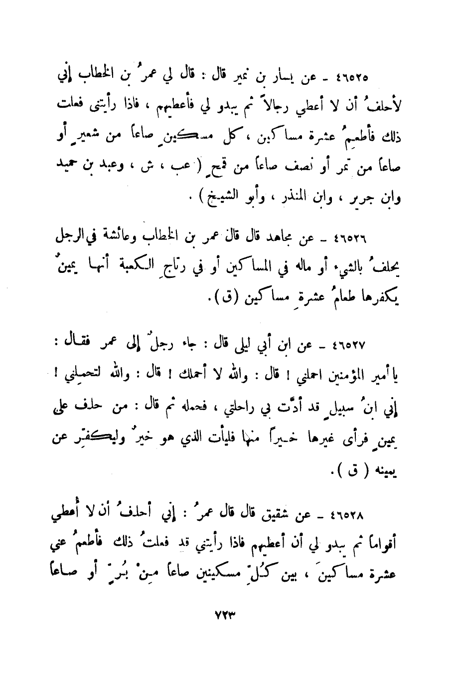 46528- عن شقيق قال قال عمر: إني أحلف أن لا أعطي أقواما ثم يبدو لي أن أعطيهم فإذا رأيتني قد فعلت ذلك فأطعم عني عشرة مساكين، بين كل مسكينين صاعا من بر أو صاعا