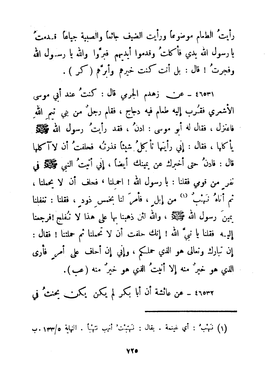 46531- عن زهدم الجرمي قال: كنت عند أبي موسى الأشعري فقرب إليه طعام فيه دجاج، فقام رجل من بني تيم الله فاعتزل، فقال له أبو موسى: ادن، فقد رأيت رسول الله صلى الله عليه وسلم يأكلها، فقال: إني رأيتها تأكل شيئا قذرته فحلفت أن لا آكلها قال: فادن حتى أخبرك عن يمينك أيضا، إني أتيت النبي صلى الله عليه وسلم في نفر من قومي فقلنا: يا رسول الله! احملنا، فحلف أن لا يحملنا، ثم أتاه نهب 1 من إبل، فأمر لنا بخمس ذود، فقلنا: تغفلنا يمين رسول الله صلى الله عليه وسلم، والله لئن ذهبنا بها على هذا لا تفلح! فرجعنا إليه فقلنا يا نبي الله! إنك حلفت أن لا تحملنا ثم حملتنا! فقال: إن تبارك وتعالى هو الذي حملكم، وإني إن أحلف على أمر فأرى الذي هو خير منه إلا أتيت الذي هو خير منه. "عب".