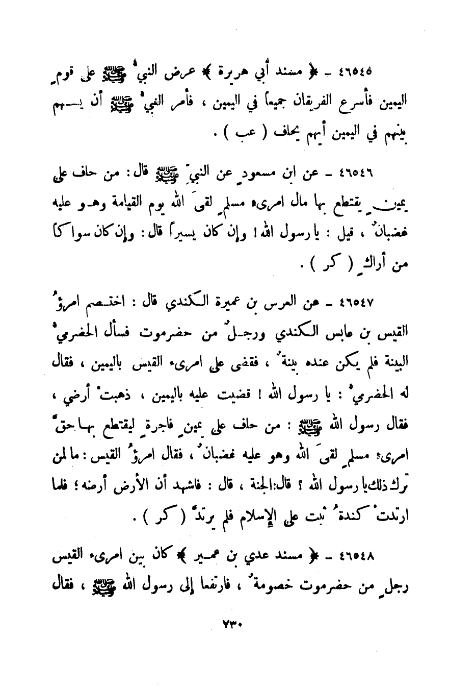 46545- "مسند أبي هريرة" عرض النبي صلى الله عليه وسلم على قوم اليمين فأسرع الفريقان جميعا في اليمين، فأمر النبي صلى الله عليه وسلم أن يسهم بينهم في اليمين أيهم يحلف. "عب".