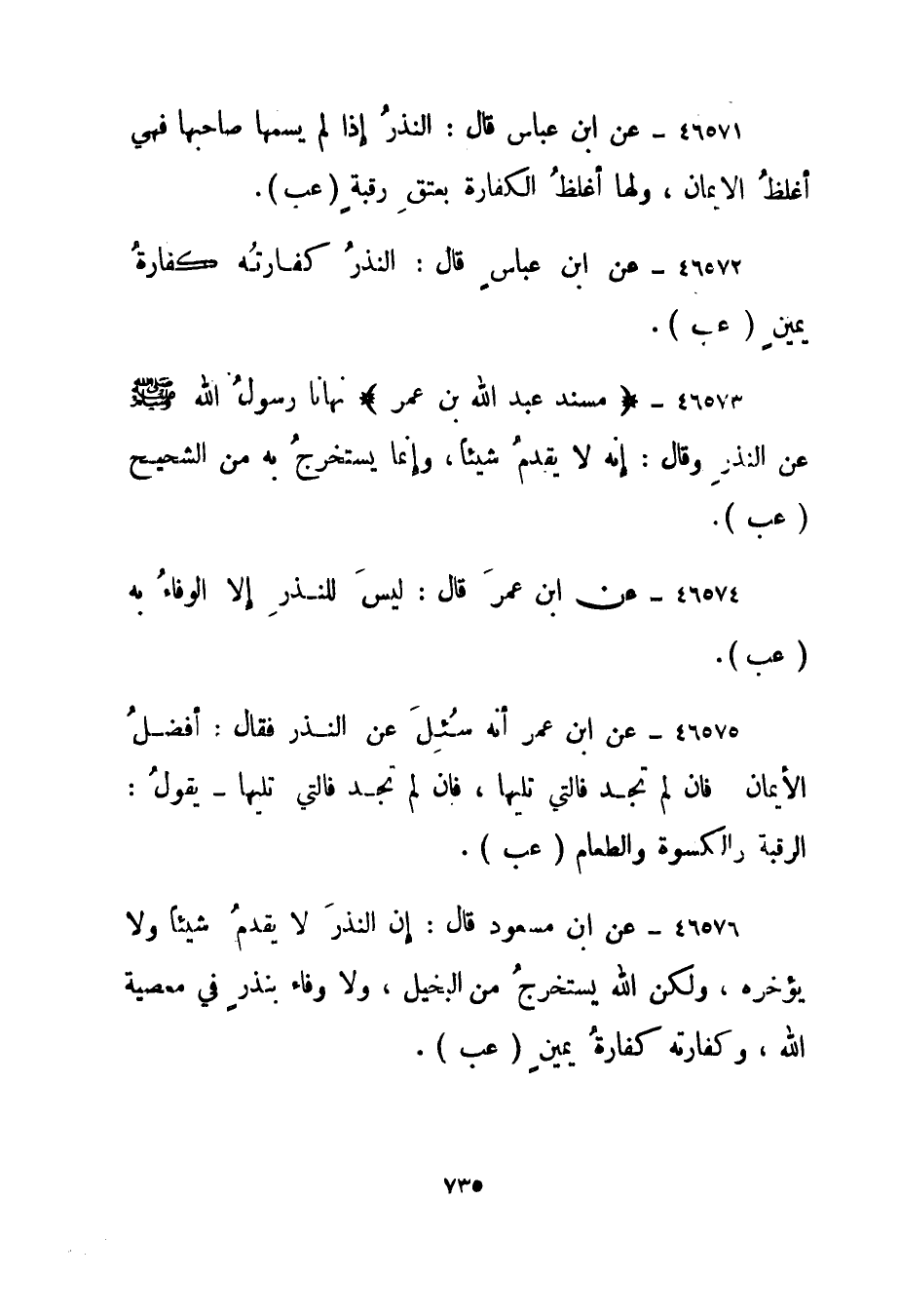 46571- عن ابن عباس قال: النذر إذا لم يسمها صاحبها فهي أغلظ الأيمان، ولها أغلظ الكفارة بعتق رقبة. "عب".