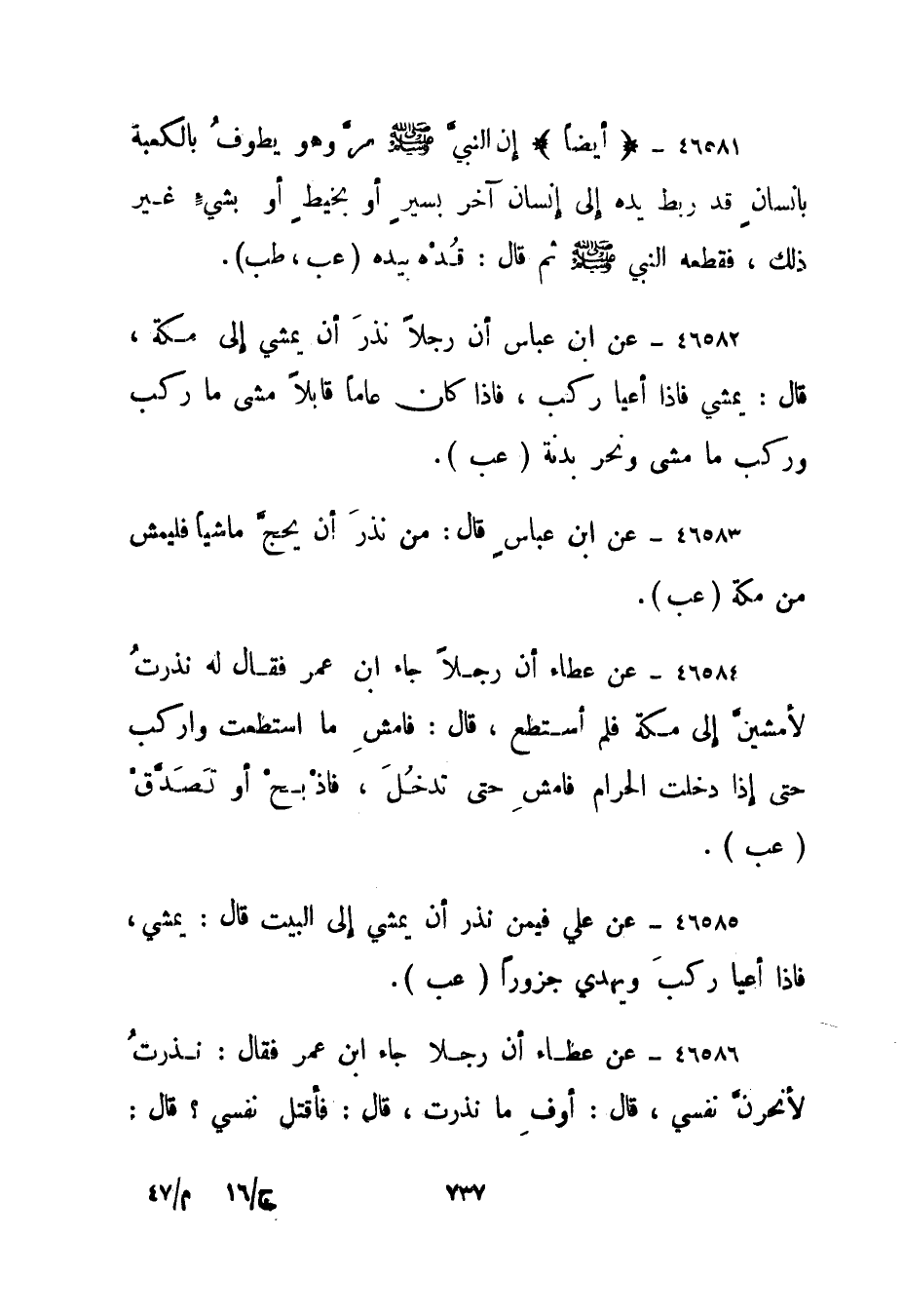 46584- عن عطاء أن رجلا جاء ابن عمر فقال له نذرت لأمشين إلى مكة فلم أستطع، قال: فامش ما استطعت واركب حتى إذا دخلت الحرام فامش حتى تدخل، فاذبح أو تصدق. "عب".
