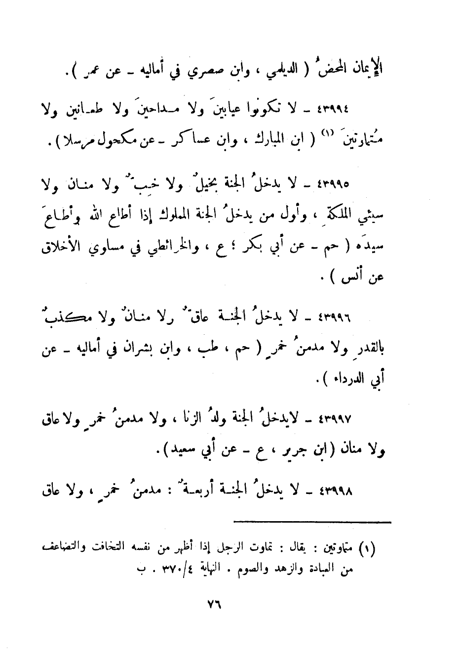 43994- لا تكونوا عيابين ولا مداحين ولا طعانين ولا متماوتين 1 "ابن المبارك، وابن عساكر - عن مكحول مرسلا".
