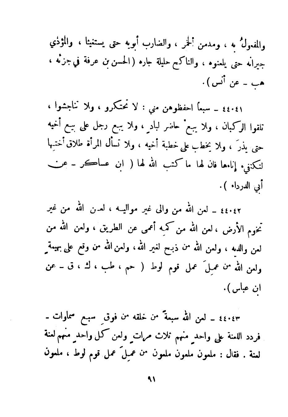 44043- لعن الله سبعة من خلقه من فوق سبع سماوات - فردد اللعنة على واحد منهم ثلاث مرات ولعن كل واحد منهم لعنة لعنة. فقال: ملعون ملعون ملعون من عمل عمل قوم لوط، ملعون