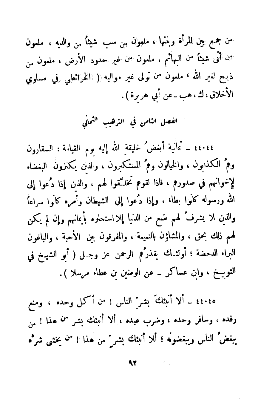 من جمع بين المرأة وبنتها، ملعون من سب شيئا من والديه، ملعون من أتى شيئا من البهائم، ملعون من غير حدود الأرض، ملعون من ذبح لغير الله، ملعون من تولى غير مواليه. "الخرائطي في مساوي الأخلاق، ك، هب - عن أبي هريرة".