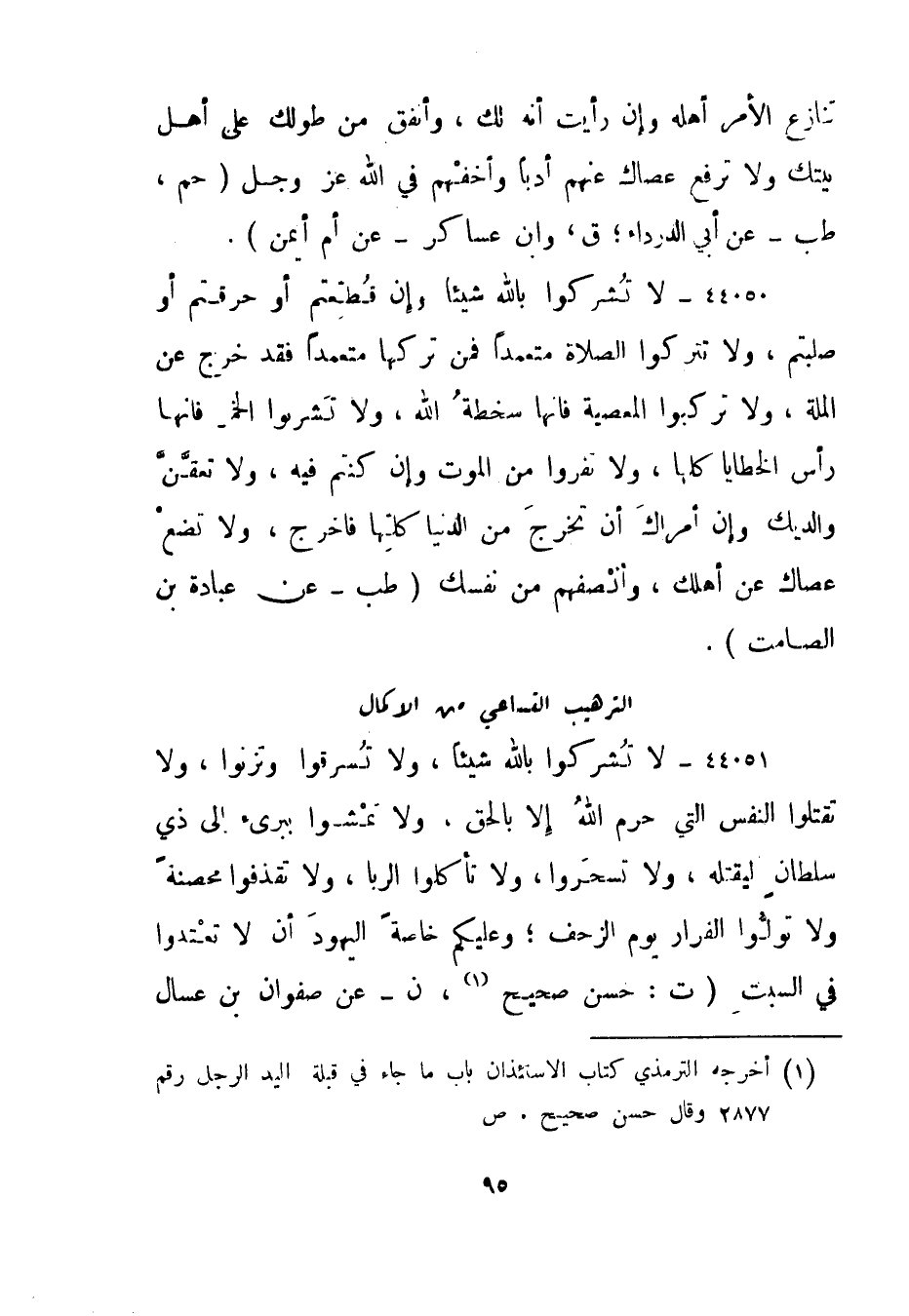 44051- لا تشركوا بالله شيئا، ولا تسرقوا وتزنوا، ولا تقتلوا النفس التي حرم الله إلا بالحق، ولا تمشوا ببريء إلى ذي سلطان ليقتله، ولا تسحروا، ولا تأكلوا الربا، ولا تقذفوا محصنة ولا تولوا الفرار يوم الزحف؛ وعليكم خاصة اليهود أن لا تعتدوا في السبت. "ت: حسن صحيح 1، ن - عن صفوان بن عسال