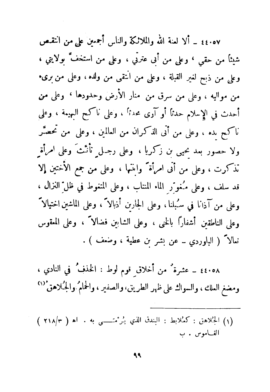 44057- ألا لعنة الله والملائكة والناس أجمعين على من انتقص شيئا من حقي، وعلى من أبى عترتي، وعلى من استخف بولايتي، وعلى من ذبح لغير القبلة، وعلى من انتفى من ولده، وعلى من برئ من مواليه، وعلى من سرق من منار الأرض وحدودها، وعلى من أحدث في الإسلام حدثا أو آوى محدثا، وعلى ناكح البهيمة، وعلى ناكح يده، وعلى من أتى الذكران من العالمين، وعلى من تحصر ولا حصور بعد يحيى بن زكريا، وعلى رجل تأنث وعلى امرأة تذكرت، وعلى من أتى امرأة وابنتها، وعلى من جمع الأختين إلا قد سلف، وعلى مغور الماء المنتاب، وعلى المتغوط في ظل النزال، وعلى من آذانا في سبلنا، وعلى الجارين أذبالا، وعلى الماشين اختيالا وعلى الناطقين أشفارا بالخنى، وعلى الشابين فضالا، وعلى المعقوس نعالا. "الباوردي - عن بشر بن عطية، وضعف".