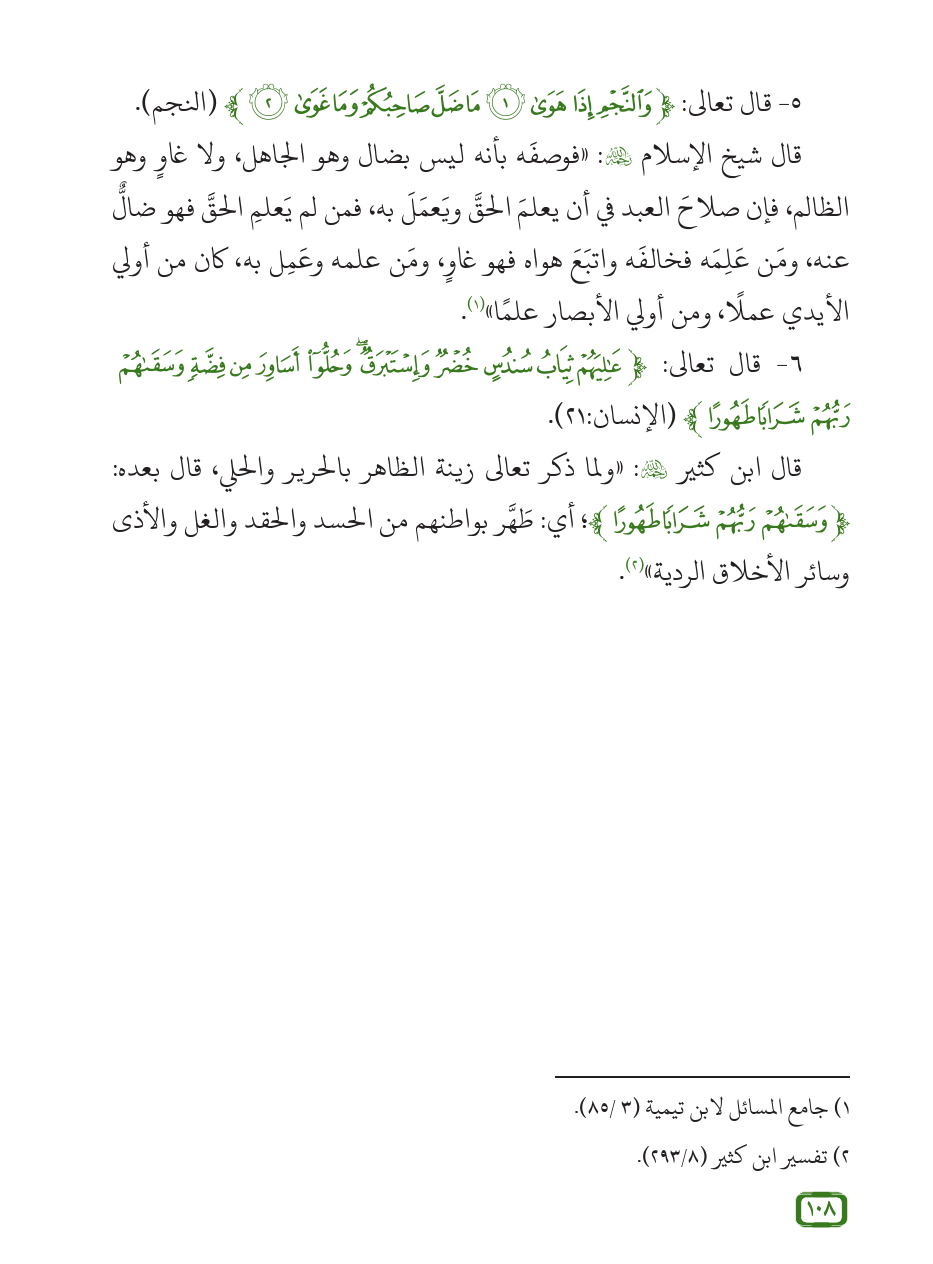 قال شيخ الإسلام - رحمه الله -: «فوصفَه بأنه ليس بضال وهو الجاهل، ولا غاوٍ وهو الظالم، فإن صلاحَ العبد في أن يعلمَ الحقَّ ويَعمَلَ به، فمن لم يَعلمِ الحقَّ فهو ضالٌّ عنه، ومَن عَلِمَه فخالفَه واتبَعَ هواه فهو غاوٍ، ومَن علمه وعَمِل به، كان من أولي الأيدي عملًا، ومن أولي الأبصار علمًا» (¬1).
