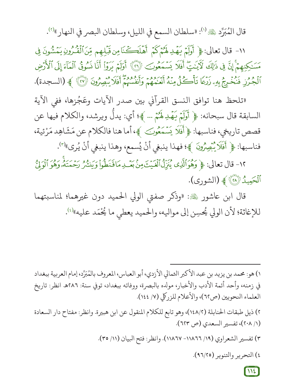 «تلحظ هنا توافق النسق القرآني بين صدر الآيات وعَجُزها، ففي الآية السابقة قال سبحانه: {أَوَلَمْ يَهْدِ لَهُمْ ... }؛ أي: يدلُّ ويرشد، والكلام فيها عن قصص تاريخي، فناسبها: {أَفَلَا يَسْمَعُونَ}، أما هنا فالكلام عن مَشَاهِد مَرْئية، فناسبها: {أَفَلَا يُبْصِرُونَ}؛ فهذا ينبغي أنْ يُسمع، وهذا ينبغي أنْ يُرى» (¬3).