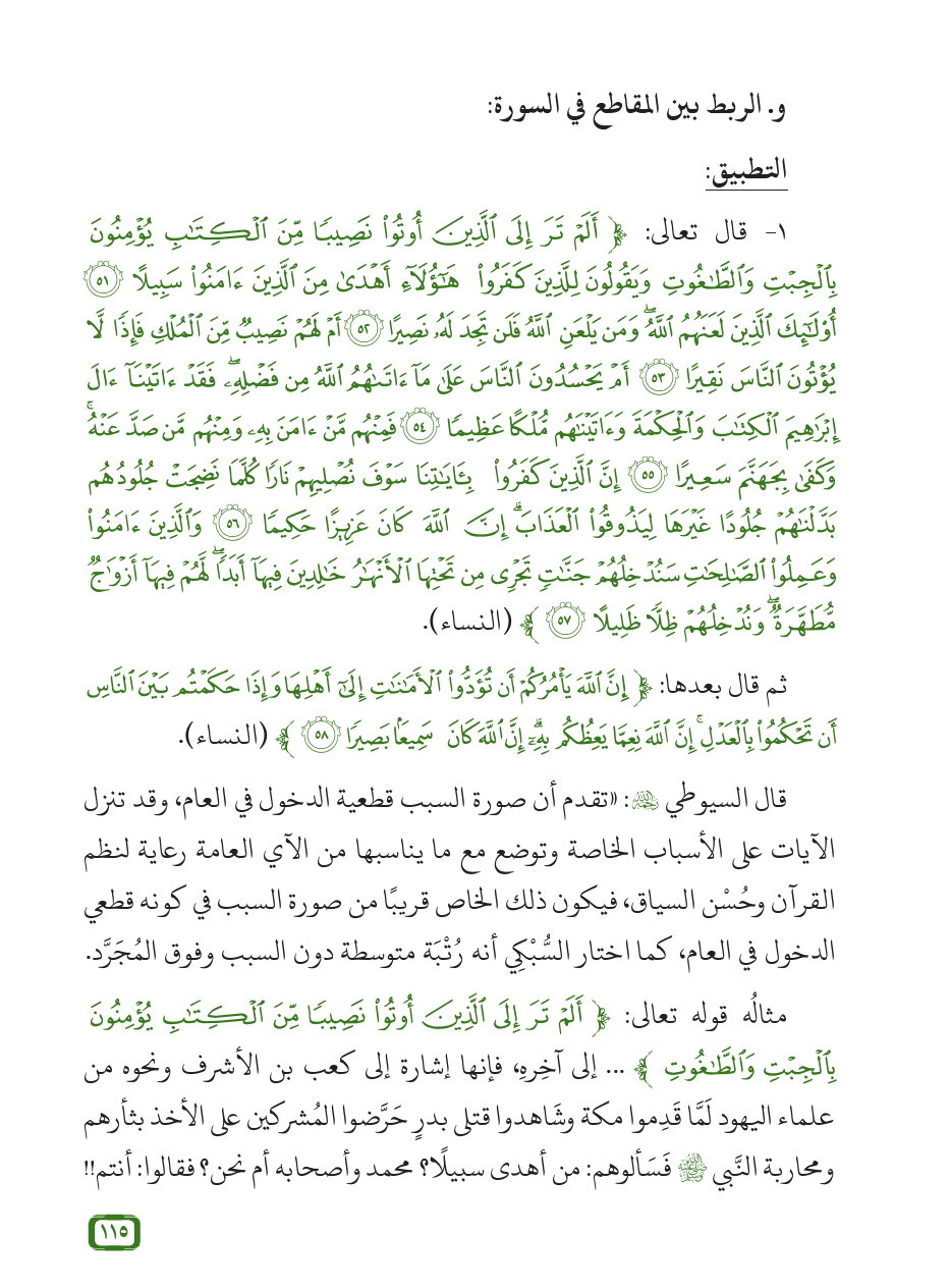 1 - قال تعالى: {أَلَمْ تَرَ إِلَى الَّذِينَ أُوتُوا نَصِيبًا مِنَ الْكِتَابِ يُؤْمِنُونَ بِالْجِبْتِ وَالطَّاغُوتِ وَيَقُولُونَ لِلَّذِينَ كَفَرُوا هَؤُلَاءِ أَهْدَى مِنَ الَّذِينَ آمَنُوا سَبِيلًا (51) أُولَئِكَ الَّذِينَ لَعَنَهُمُ اللَّهُ وَمَنْ يَلْعَنِ اللَّهُ فَلَنْ تَجِدَ لَهُ نَصِيرًا (52) أَمْ لَهُمْ نَصِيبٌ مِنَ الْمُلْكِ فَإِذًا لَا يُؤْتُونَ النَّاسَ نَقِيرًا (53) أَمْ يَحْسُدُونَ النَّاسَ عَلَى مَا آتَاهُمُ اللَّهُ مِنْ فَضْلِهِ فَقَدْ آتَيْنَا آلَ إِبْرَاهِيمَ الْكِتَابَ وَالْحِكْمَةَ وَآتَيْنَاهُمْ مُلْكًا عَظِيمًا (54) فَمِنْهُمْ مَنْ آمَنَ بِهِ وَمِنْهُمْ مَنْ صَدَّ عَنْهُ وَكَفَى بِجَهَنَّمَ سَعِيرًا (55) إِنَّ الَّذِينَ كَفَرُوا بِآيَاتِنَا سَوْفَ نُصْلِيهِمْ نَارًا كُلَّمَا نَضِجَتْ جُلُودُهُمْ بَدَّلْنَاهُمْ جُلُودًا غَيْرَهَا لِيَذُوقُوا الْعَذَابَ إِنَّ اللَّهَ كَانَ عَزِيزًا حَكِيمًا (56) وَالَّذِينَ آمَنُوا وَعَمِلُوا الصَّالِحَاتِ سَنُدْخِلُهُمْ جَنَّاتٍ تَجْرِي مِنْ تَحْتِهَا الْأَنْهَارُ خَالِدِينَ فِيهَا أَبَدًا لَهُمْ فِيهَا أَزْوَاجٌ مُطَهَّرَةٌ وَنُدْخِلُهُمْ ظِلًّا ظَلِيلًا (57)} (النساء).