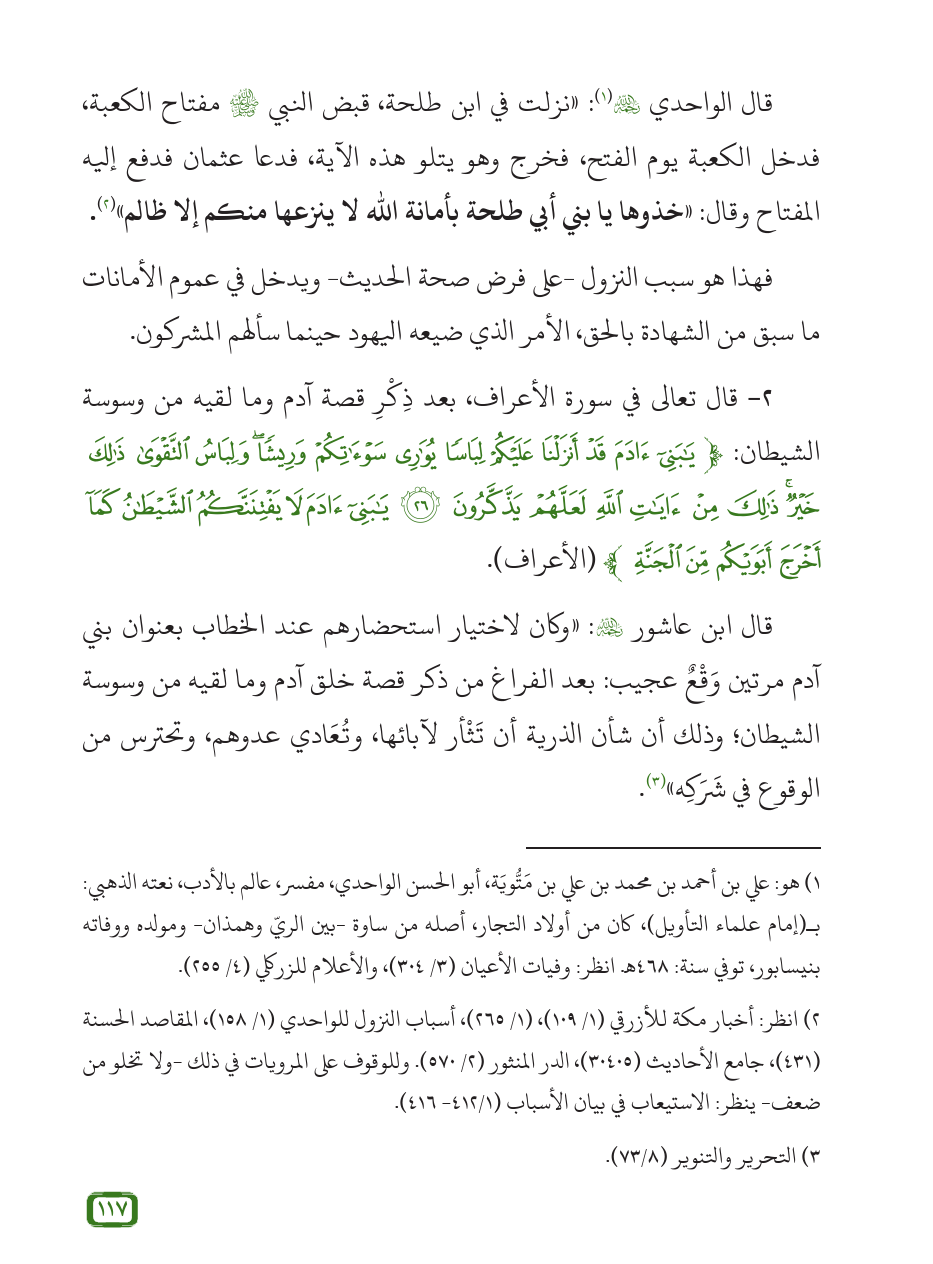 قال ابن عاشور - رحمه الله -: «وكان لاختيار استحضارهم عند الخطاب بعنوان بني آدم مرتين وَقْعٌ عجيب: بعد الفراغ من ذكر قصة خلق آدم وما لقيه من وسوسة الشيطان؛ وذلك أن شأن الذرية أن تَثْأر لآبائها، وتُعَادي عدوهم، وتحترس من الوقوع في شَرَكِه» (¬3).