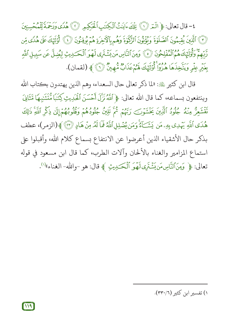 قال ابن كثير - رحمه الله -: «لما ذكر تعالى حال السعداء، وهم الذين يهتدون بكتاب الله وينتفعون بسماعه، كما قال الله تعالى: {اللَّهُ نَزَّلَ أَحْسَنَ الْحَدِيثِ كِتَابًا مُتَشَابِهًا مَثَانِيَ تَقْشَعِرُّ مِنْهُ جُلُودُ الَّذِينَ يَخْشَوْنَ رَبَّهُمْ ثُمَّ تَلِينُ جُلُودُهُمْ وَقُلُوبُهُمْ إِلَى ذِكْرِ اللَّهِ ذَلِكَ هُدَى اللَّهِ يَهْدِي بِهِ مَنْ يَشَاءُ وَمَنْ يُضْلِلِ اللَّهُ فَمَا لَهُ مِنْ هَادٍ (23)} (الزمر)، عطف بذكر حال الأشقياء الذين أعرضوا عن الانتفاع بسماع كلام الله، وأقبلوا على استماع المزامير والغناء بالألحان وآلات الطرب، كما قال ابن مسعود في قوله تعالى: {وَمِنَ النَّاسِ مَنْ يَشْتَرِي لَهْوَ الْحَدِيثِ} قال: هو -والله- الغناء» (¬1).