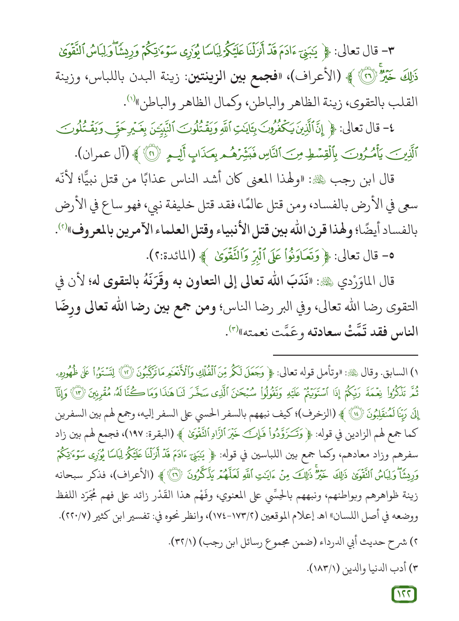 3 - قال تعالى: {يَابَنِي آدَمَ قَدْ أَنْزَلْنَا عَلَيْكُمْ لِبَاسًا يُوَارِي سَوْآتِكُمْ وَرِيشًا وَلِبَاسُ التَّقْوَى ذَلِكَ خَيْرٌ (26)} (الأعراف)، «فجمع بين الزينتين: زينة البدن باللباس، وزينة القلب بالتقوى، زينة الظاهر والباطن، وكمال الظاهر والباطن» (¬1).