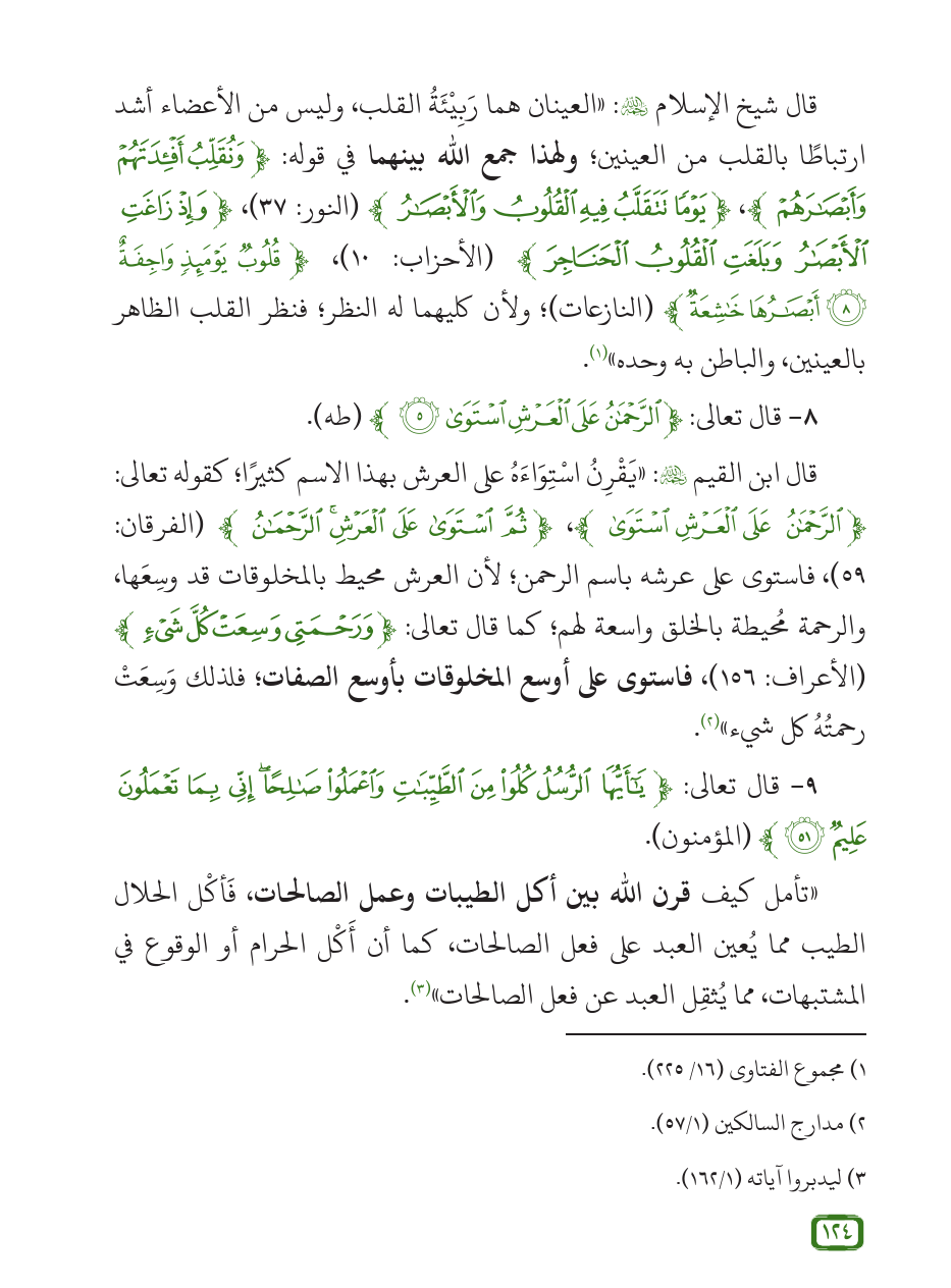 «تأمل كيف قرن الله بين أكل الطيبات وعمل الصالحات، فَأكْل الحلال الطيب مما يُعين العبد على فعل الصالحات، كما أن أَكْل الحرام أو الوقوع في المشتبهات، مما يُثقِل العبد عن فعل الصالحات» (¬3).