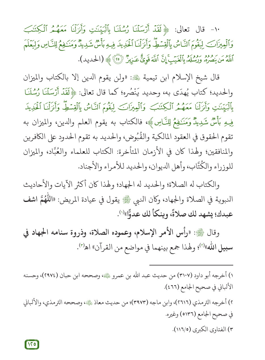 والكتاب له الصلاة؛ والحديد له الجهاد؛ ولهذا كان أكثر الآيات والأحاديث النبوية في الصلاة والجهاد، وكان النبي - صلى الله عليه وسلم - يقول في عيادة المريض: «اللهم اشف عبدك؛ يشهد لك صلاةً، وينكأ لك عدوًّا» (¬1).