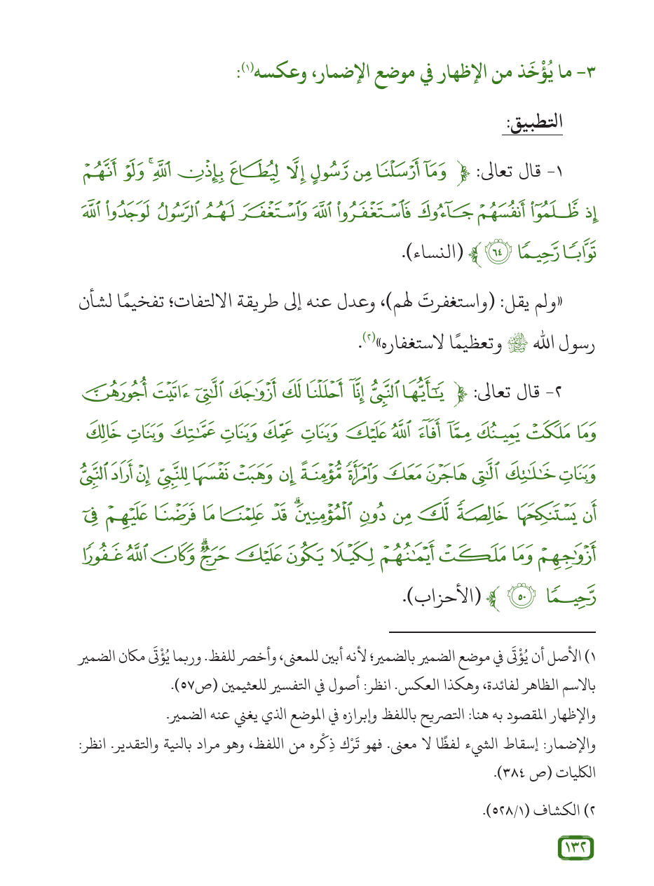 (¬1) الأصل أن يُؤْتَى في موضع الضمير بالضمير؛ لأنه أبين للمعنى، وأخصر للفظ. وربما يُؤْتَى مكان الضمير بالاسم الظاهر لفائدة، وهكذا العكس. انظر: أصول في التفسير للعثيمين (ص 57).