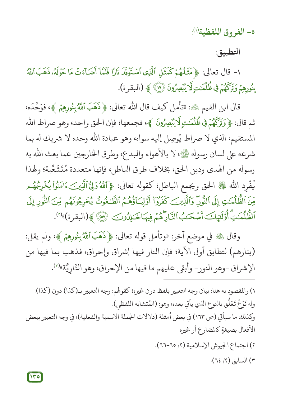 قال ابن القيم - رحمه الله -: «تأمل كيف قال الله تعالى: {ذَهَبَ اللَّهُ بِنُورِهِمْ}، فوَحَّدَه، ثم قال: {وَتَرَكَهُمْ فِي ظُلُمَاتٍ لَا يُبْصِرُونَ}، فجمعها؛ فإن الحق واحد، وهو صراط الله المستقيم، الذي لا صراط يُوصِل إليه سواه، وهو عبادة الله وحده لا شريك له بما شرعه على لسان رسوله - صلى الله عليه وسلم -، لا بالأهواء والبدع، وطرق الخارجين عما بعث الله به رسوله من الهدى ودين الحق، بخلاف طرق الباطل، فإنها متعددة مُتَشَعِّبة؛ ولهذا يُفْرِد الله - سبحانه وتعالى - الحق ويجمع الباطل؛ كقوله تعالى: {اللَّهُ وَلِيُّ الَّذِينَ آمَنُوا يُخْرِجُهُمْ مِنَ الظُّلُمَاتِ إِلَى النُّورِ وَالَّذِينَ كَفَرُوا أَوْلِيَاؤُهُمُ الطَّاغُوتُ يُخْرِجُونَهُمْ مِنَ النُّورِ إِلَى الظُّلُمَاتِ أُولَئِكَ أَصْحَابُ النَّارِ هُمْ فِيهَا خَالِدُونَ (257)} (البقرة)» (¬2).
