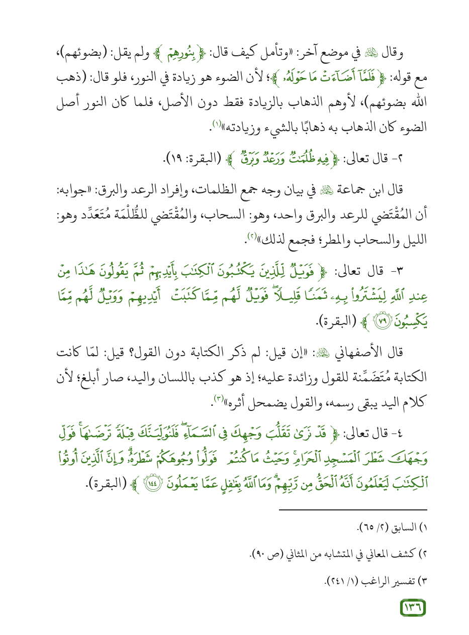 وقال - رحمه الله - في موضع آخر: «وتأمل كيف قال: {بِنُورِهِمْ} ولم يقل: (بضوئهم)، مع قوله: {فَلَمَّا أَضَاءَتْ مَا حَوْلَهُ}؛ لأن الضوء هو زيادة في النور، فلو قال: (ذهب الله بضوئهم)، لأوهم الذهاب بالزيادة فقط دون الأصل، فلما كان النور أصل الضوء كان الذهاب به ذهابًا بالشيء وزيادته» (¬1).