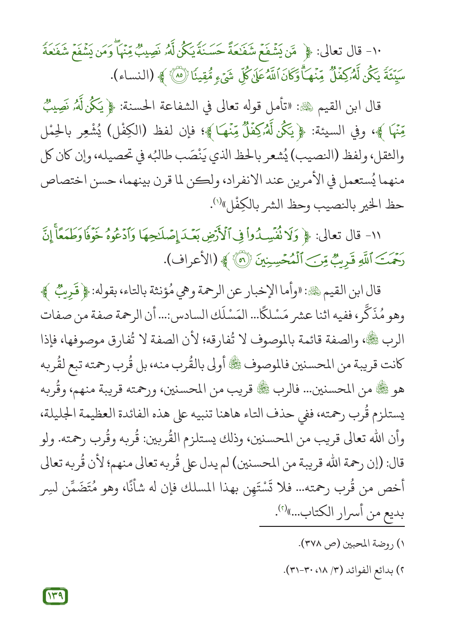 قال ابن القيم - رحمه الله -: «وأما الإخبار عن الرحمة وهي مُؤنثة بالتاء، بقوله: {قَرِيبٌ} وهو مُذَكَّر، ففيه اثنا عشر مَسْلكًا ... المَسْلَك السادس: ... أن الرحمة صفة من صفات الرب - تبارك وتعالى -، والصفة قائمة بالموصوف لا تُفارقه؛ لأن الصفة لا تُفارق موصوفها، فإذا كانت قريبة من المحسنين فالموصوف - تبارك وتعالى - أولى بالقُرب منه، بل قُرب رحمته تبع لقُربه هو - تبارك وتعالى - من المحسنين ... فالرب - تبارك وتعالى - قريب من المحسنين، ورحمته قريبة منهم، وقُربه يستلزم قُرب رحمته، ففي حذف التاء هاهنا تنبيه على هذه الفائدة العظيمة الجليلة، وأن الله تعالى قريب من المحسنين، وذلك يستلزم القُربين: قُربه وقُرب رحمته. ولو قال: (إن رحمة الله قريبة من المحسنين) لم يدل على قُربه تعالى منهم؛ لأن قُربه تعالى أخص من قُرب رحمته ... فلا تَسْتَهِن بهذا المسلك فإن له شأنًا، وهو مُتَضَمِّن لسِر بديع من أسرار الكتاب ... » (¬2).