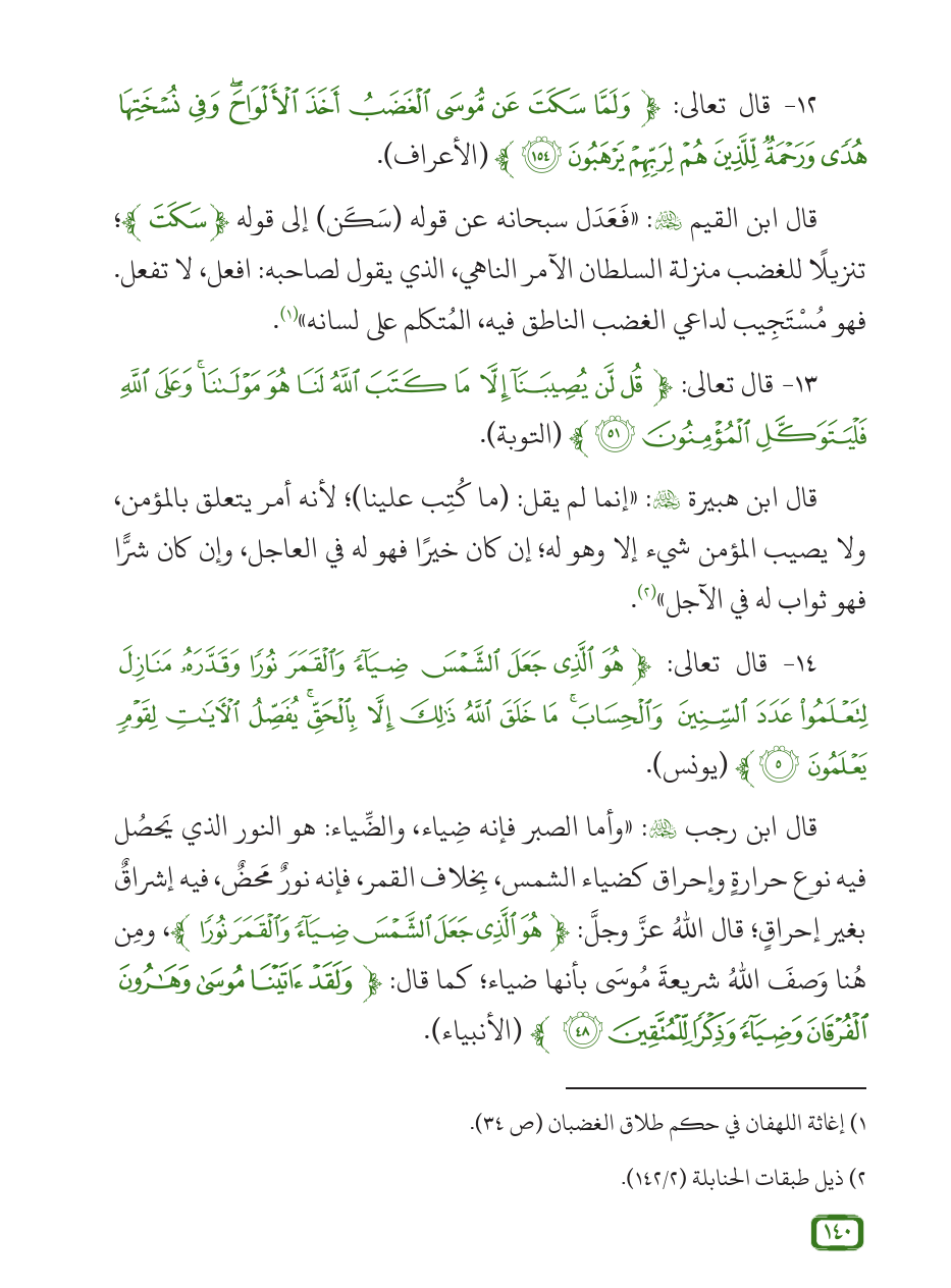 قال ابن رجب - رحمه الله -: «وأما الصبر فإنه ضِياء، والضِّياء: هو النور الذي يَحصُل فيه نوع حرارةٍ وإحراق كضياء الشمس، بِخلاف القمر، فإنه نورٌ مَحضٌ، فيه إشراقٌ بغير إحراقٍ؛ قال اللهُ عزَّ وجلَّ: {هُوَ الَّذِي جَعَلَ الشَّمْسَ ضِيَاءً وَالْقَمَرَ نُورًا}، ومِن هُنا وَصفَ اللهُ شريعةَ مُوسَى بأنها ضياء؛ كما قال: {وَلَقَدْ آتَيْنَا مُوسَى وَهَارُونَ الْفُرْقَانَ وَضِيَاءً وَذِكْرًا لِلْمُتَّقِينَ (48)} (الأنبياء).