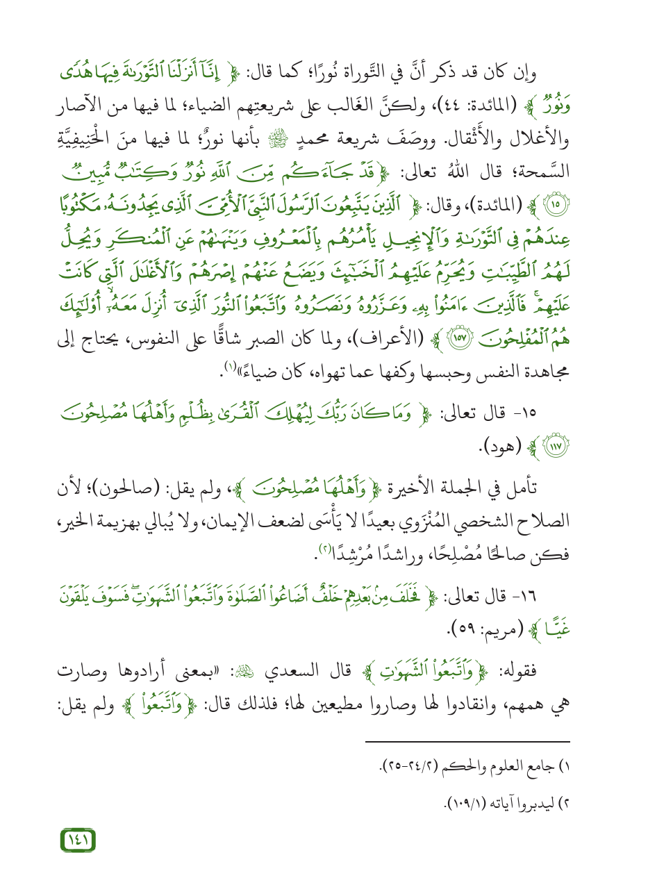 وإن كان قد ذكر أنَّ في التَّوراة نُورًا؛ كما قال: {إِنَّا أَنْزَلْنَا التَّوْرَاةَ فِيهَا هُدًى وَنُورٌ} (المائدة: 44)، ولكنَّ الغَالب على شريعتِهم الضياء؛ لما فيها من الآصار والأغلال والأَثْقال. ووصَفَ شريعة محمدٍ - صلى الله عليه وسلم - بأنها نورٌ؛ لما فيها منَ الْحَنِيفِيَّةِ السَّمحة؛ قال اللهُ تعالى: {قَدْ جَاءَكُمْ مِنَ اللَّهِ نُورٌ وَكِتَابٌ مُبِينٌ (15)} (المائدة)، وقال: {الَّذِينَ يَتَّبِعُونَ الرَّسُولَ النَّبِيَّ الْأُمِّيَّ الَّذِي يَجِدُونَهُ مَكْتُوبًا عِنْدَهُمْ فِي التَّوْرَاةِ وَالْإِنْجِيلِ يَأْمُرُهُمْ بِالْمَعْرُوفِ وَيَنْهَاهُمْ عَنِ الْمُنْكَرِ وَيُحِلُّ لَهُمُ الطَّيِّبَاتِ وَيُحَرِّمُ عَلَيْهِمُ الْخَبَائِثَ وَيَضَعُ عَنْهُمْ إِصْرَهُمْ وَالْأَغْلَالَ الَّتِي كَانَتْ عَلَيْهِمْ فَالَّذِينَ آمَنُوا بِهِ وَعَزَّرُوهُ وَنَصَرُوهُ وَاتَّبَعُوا النُّورَ الَّذِي أُنْزِلَ مَعَهُ أُولَئِكَ هُمُ الْمُفْلِحُونَ (157)} (الأعراف)، ولما كان الصبر شاقًّا على النفوس، يحتاج إلى مجاهدة النفس وحبسها وكفها عما تهواه، كان ضياءً» (¬1).