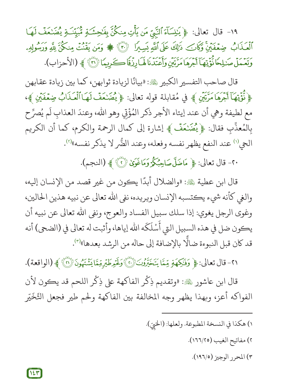19 - قال تعالى: {يَانِسَاءَ النَّبِيِّ مَنْ يَأْتِ مِنْكُنَّ بِفَاحِشَةٍ مُبَيِّنَةٍ يُضَاعَفْ لَهَا الْعَذَابُ ضِعْفَيْنِ وَكَانَ ذَلِكَ عَلَى اللَّهِ يَسِيرًا (30) وَمَنْ يَقْنُتْ مِنْكُنَّ لِلَّهِ وَرَسُولِهِ وَتَعْمَلْ صَالِحًا نُؤْتِهَا أَجْرَهَا مَرَّتَيْنِ وَأَعْتَدْنَا لَهَا رِزْقًا كَرِيمًا (31)} (الأحزاب).