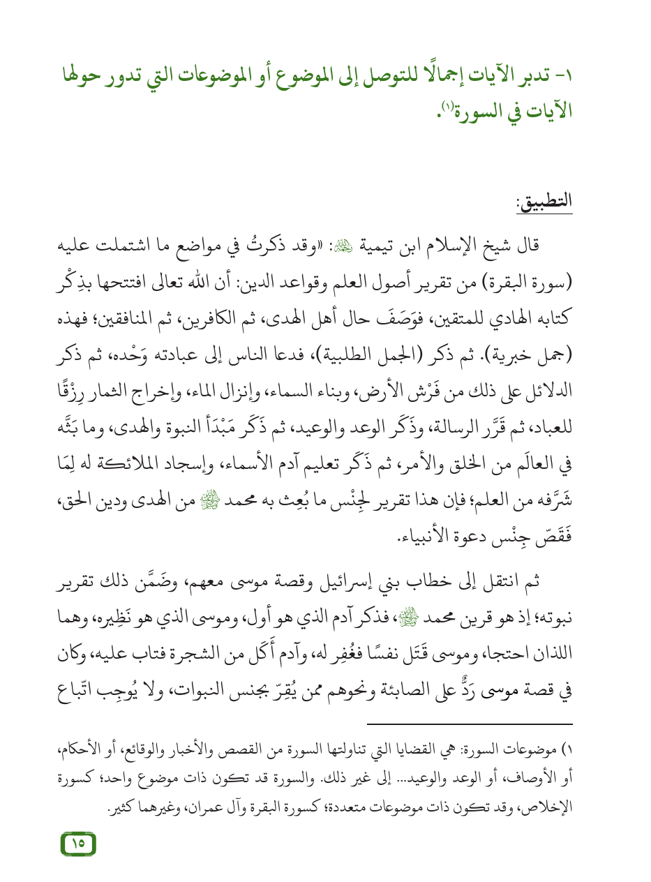 (¬1) موضوعات السورة: هي القضايا التي تناولتها السورة من القصص والأخبار والوقائع، أو الأحكام، أو الأوصاف، أو الوعد والوعيد ... إلى غير ذلك. والسورة قد تكون ذات موضوع واحد؛ كسورة الإخلاص، وقد تكون ذات موضوعات متعددة؛ كسورة البقرة وآل عمران، وغيرهما كثير.