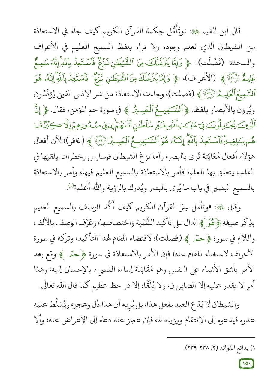 قال ابن القيم - رحمه الله -: «وتَأَمَّل حِكْمة القرآن الكريم كيف جاء في الاستعاذة من الشيطان الذي نعلم وجوده ولا نراه بلفظ السميع العليم في الأعراف والسجدة (فُصِّلَت): {وَإِمَّا يَنْزَغَنَّكَ مِنَ الشَّيْطَانِ نَزْغٌ فَاسْتَعِذْ بِاللَّهِ إِنَّهُ سَمِيعٌ عَلِيمٌ (200)} (الأعراف)، {وَإِمَّا يَنْزَغَنَّكَ مِنَ الشَّيْطَانِ نَزْغٌ فَاسْتَعِذْ بِاللَّهِ إِنَّهُ هُوَ السَّمِيعُ الْعَلِيمُ (36)} (فصلت)، وجاءت الاستعاذة من شر الإنس الذين يُؤنَسُون ويُرون بالأبصار بلفظ: {السَّمِيعُ الْبَصِيرُ} في سورة حم المؤمن، فقال: {إِنَّ الَّذِينَ يُجَادِلُونَ فِي آيَاتِ اللَّهِ بِغَيْرِ سُلْطَانٍ أَتَاهُمْ إِنْ فِي صُدُورِهِمْ إِلَّا كِبْرٌ مَا هُمْ بِبَالِغِيهِ فَاسْتَعِذْ بِاللَّهِ إِنَّهُ هُوَ السَّمِيعُ الْبَصِيرُ (56)} (غافر)؛ لأن أفعال هؤلاء أفعال مُعَايَنة تُرى بالبصر، وأما نزغ الشيطان فوساوس وخطرات يلقيها في القلب يتعلق بها العلم؛ فأمر بالاستعاذة بالسميع العليم فيها، وأمر بالاستعاذة بالسميع البصير في باب ما يُرى بالبصر ويُدرك بالرؤية والله أعلم» (¬1).