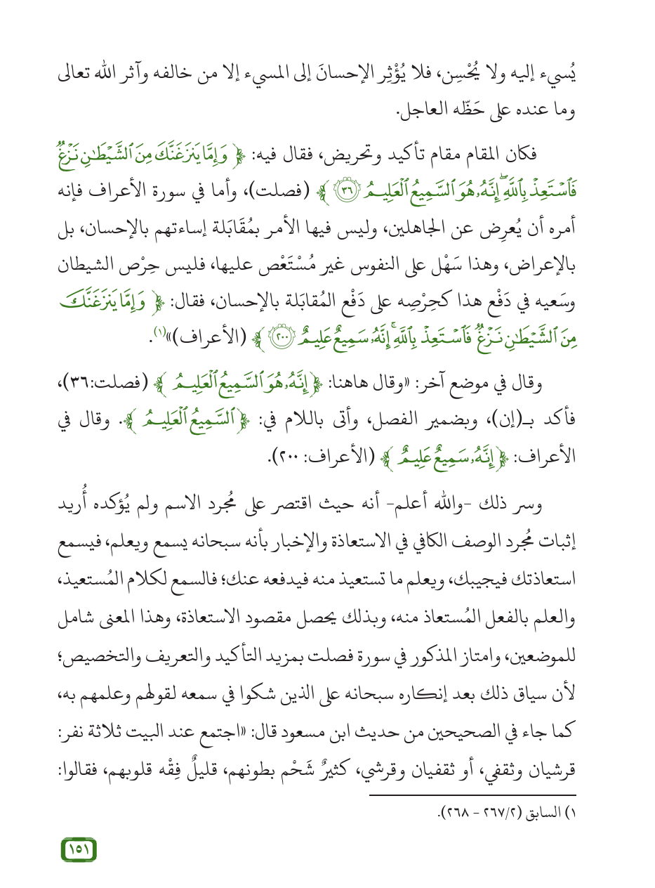 فكان المقام مقام تأكيد وتحريض، فقال فيه: {وَإِمَّا يَنْزَغَنَّكَ مِنَ الشَّيْطَانِ نَزْغٌ فَاسْتَعِذْ بِاللَّهِ إِنَّهُ هُوَ السَّمِيعُ الْعَلِيمُ (36)} (فصلت)، وأما في سورة الأعراف فإنه أمره أن يُعرِض عن الجاهلين، وليس فيها الأمر بمُقَابَلة إساءتهم بالإحسان، بل بالإعراض، وهذا سَهْل على النفوس غير مُسْتَعْص عليها، فليس حِرْص الشيطان وسَعيه في دَفْع هذا كحِرْصِه على دَفْع المُقابَلة بالإحسان، فقال: {وَإِمَّا يَنْزَغَنَّكَ مِنَ الشَّيْطَانِ نَزْغٌ فَاسْتَعِذْ بِاللَّهِ إِنَّهُ سَمِيعٌ عَلِيمٌ (200)} (الأعراف)» (¬1).