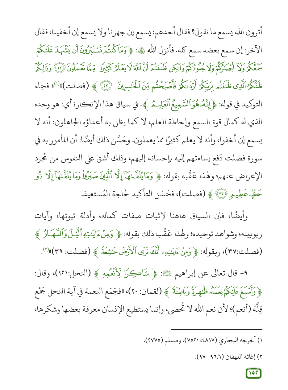 أترون الله يسمع ما نقول؟ فقال أحدهم: يسمع إن جهرنا ولا يسمع إن أخفينا، فقال الآخر: إن سمع بعضه سمع كله. فأنزل الله - عز وجل -: {وَمَا كُنْتُمْ تَسْتَتِرُونَ أَنْ يَشْهَدَ عَلَيْكُمْ سَمْعُكُمْ وَلَا أَبْصَارُكُمْ وَلَا جُلُودُكُمْ وَلَكِنْ ظَنَنْتُمْ أَنَّ اللَّهَ لَا يَعْلَمُ كَثِيرًا مِمَّا تَعْمَلُونَ (22) وَذَلِكُمْ ظَنُّكُمُ الَّذِي ظَنَنْتُمْ بِرَبِّكُمْ أَرْدَاكُمْ فَأَصْبَحْتُمْ مِنَ الْخَاسِرِينَ (23)} (فصلت)» (¬1)؛ فجاء التوكيد في قوله: {إِنَّهُ هُوَ السَّمِيعُ الْعَلِيمُ}. في سياق هذا الإنكار؛ أي: هو وحده الذي له كمال قوة السمع وإحاطة العلم، لا كما يظن به أعداؤه الجاهلون: أنه لا يسمع إن أخفوا، وأنه لا يعلم كثيرًا مما يعملون. وحَسَّن ذلك أيضًا: أن المأمور به في سورة فصلت دَفْع إساءتهم إليه بإحسانه إليهم، وذلك أشق على النفوس من مُجرد الإعراض عنهم؛ ولهذا عَقَّبه بقوله: {وَمَا يُلَقَّاهَا إِلَّا الَّذِينَ صَبَرُوا وَمَا يُلَقَّاهَا إِلَّا ذُو حَظٍّ عَظِيمٍ (35)} (فصلت)، فحَسُن التأكيد لحاجة المُستعيذ.