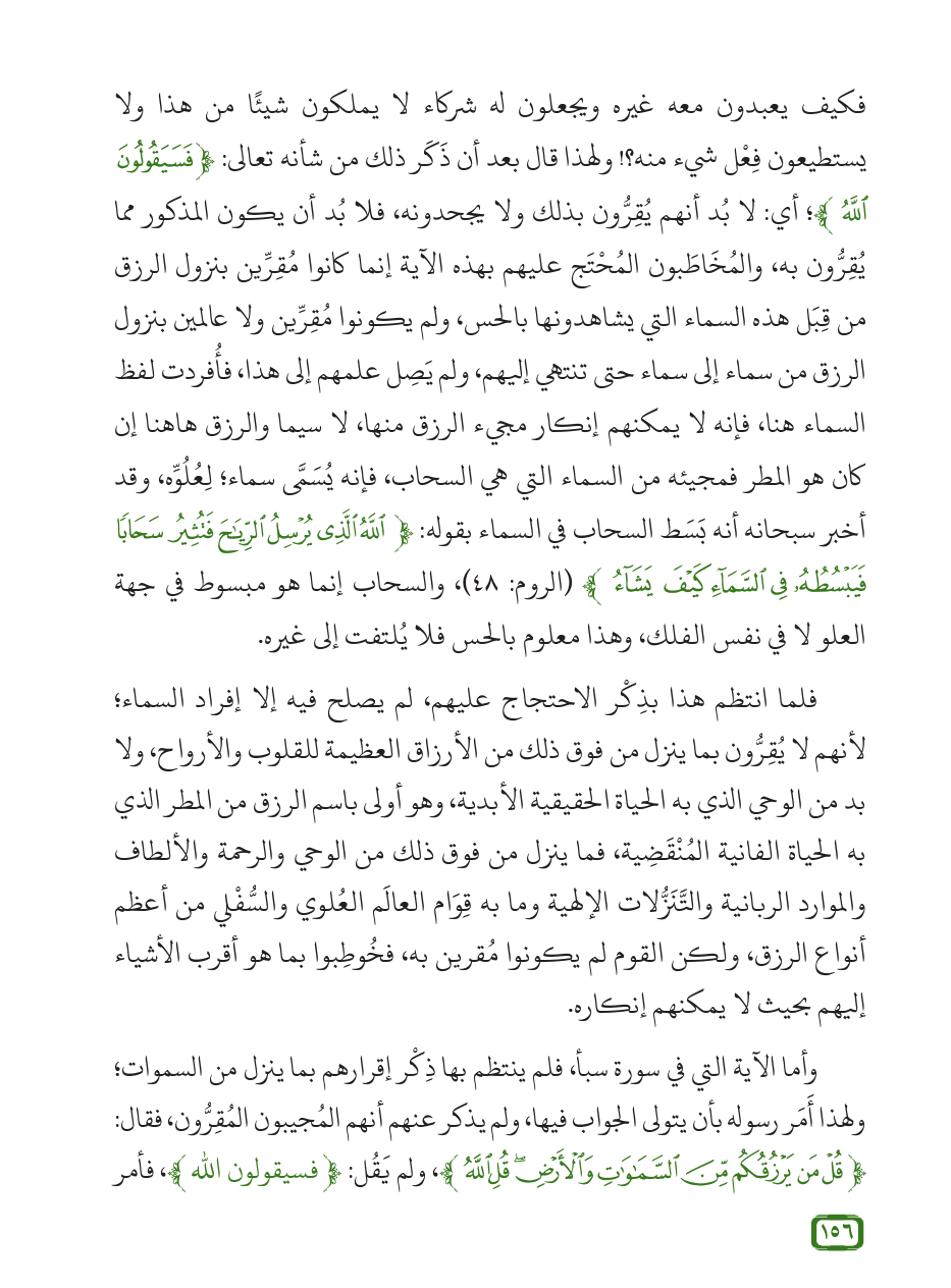 فلما انتظم هذا بذِكْر الاحتجاج عليهم، لم يصلح فيه إلا إفراد السماء؛ لأنهم لا يُقِرُّون بما ينزل من فوق ذلك من الأرزاق العظيمة للقلوب والأرواح، ولا بد من الوحي الذي به الحياة الحقيقية الأبدية، وهو أولى باسم الرزق من المطر الذي به الحياة الفانية المُنْقَضِية، فما ينزل من فوق ذلك من الوحي والرحمة والألطاف والموارد الربانية والتَّنَزُّلات الإلهية وما به قِوَام العالَم العُلوي والسُّفْلي من أعظم أنواع الرزق، ولكن القوم لم يكونوا مُقرين به، فخُوطِبوا بما هو أقرب الأشياء إليهم بحيث لا يمكنهم إنكاره.