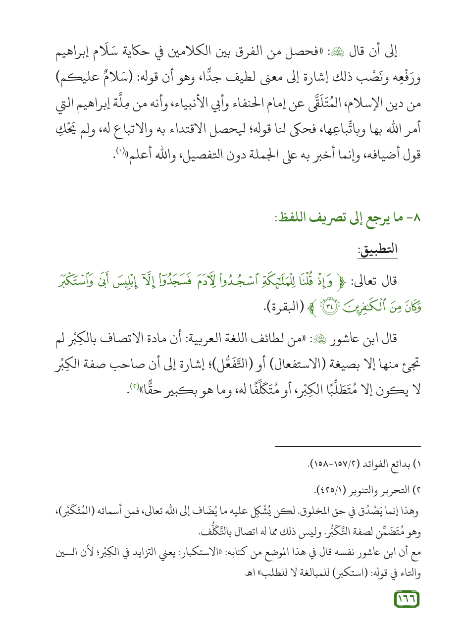 قال ابن عاشور - رحمه الله -: «من لطائف اللغة العربية: أن مادة الاتصاف بالكِبْر لم تجئ منها إلا بصيغة (الاستفعال) أو (التَّفَعُّل)؛ إشارة إلى أن صاحب صفة الكِبْر لا يكون إلا مُتَطَلِّبًا الكِبْر، أو مُتَكَلِّفًا له، وما هو بكبير حقًّا» (¬2).